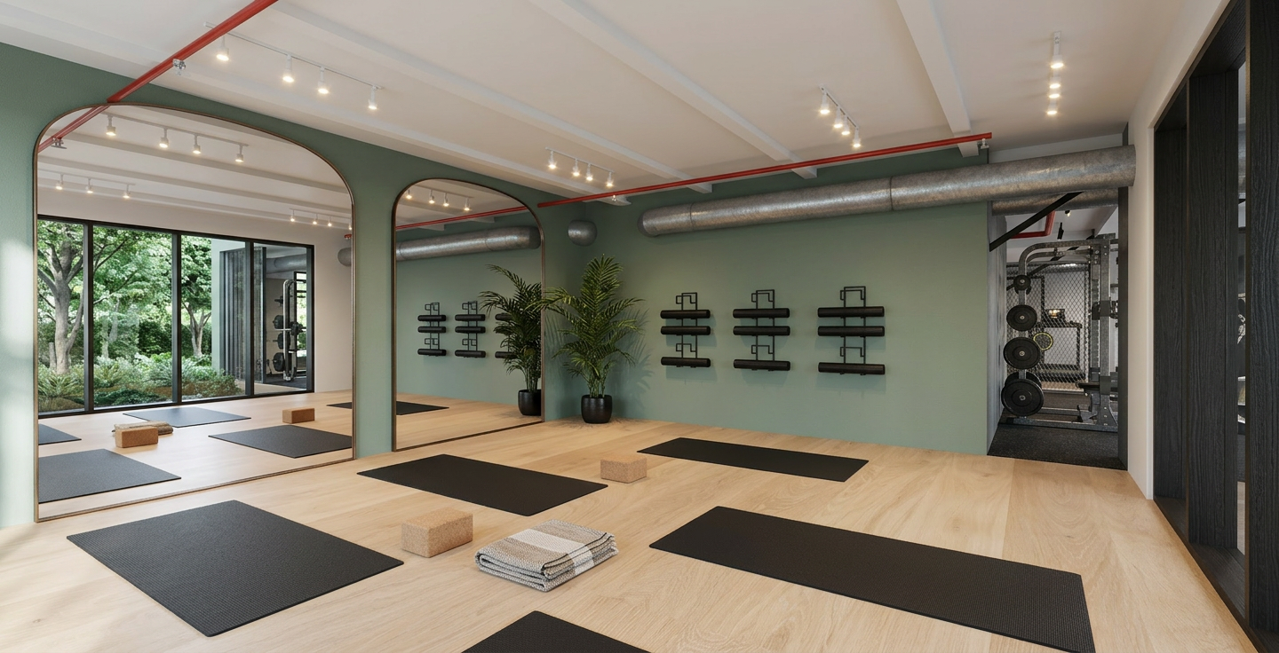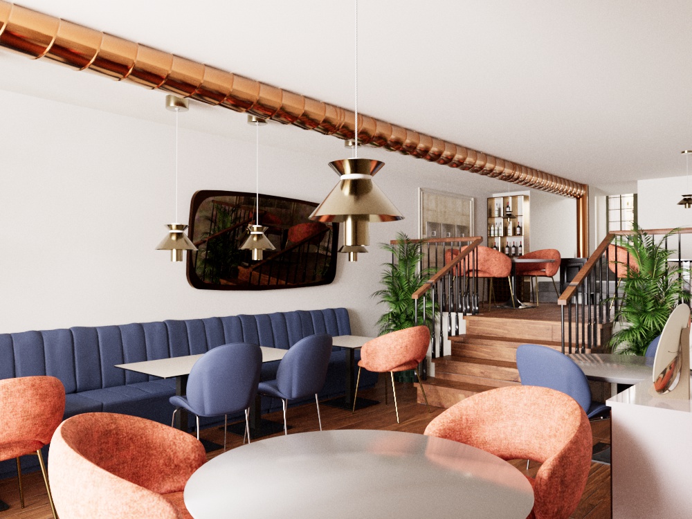 use the provided image as a fixed base maintain color mode preserve exactly the same geometry architecture camera position perspective proportions ceiling copper pipe stairs railings floor and furniture placement do not modify architecture layout or spatial configuration enhance the scene to create an ultra photorealistic luxury restaurant atmosphere all materials must appear high end refined and extremely realistic chairs must be upholstered in deep burnt terracotta and deep navy velvet hyper realistic rich tactile velvet fabric with visible grain subtle sheen soft folds and natural light absorption not plastic or glossy the long bench seating must appear in deep navy velvet upholstery rich padded texture with subtle stitching and realistic fabric depth the pendant lamps must appear extremely realistic with refined materials warm copper and soft matte surfaces elegant light diffusion and subtle reflections the mirrors on the wall must appear as dark vintage smoked mirrors with soft reflections and slightly aged tone enhancing the warm luxury mood of the space the stair railing must enhance the black metal vertical bars with a refined matte black finish and elegant subtle reflections tables must include a minimal chic luxury table setting refined porcelain plates crystal glasses elegant metallic cutlery linen napkins and subtle candles naturally arranged enhance material realism across the scene deeper wood grain on the floor refined copper reflections on the ceiling pipe and soft realistic material imperfections lighting must be warm and cinematic around 2700k creating an intimate upscale dining atmosphere with soft shadows depth and refined contrast ultra photorealistic intimate elegant contemporary fine dining mood