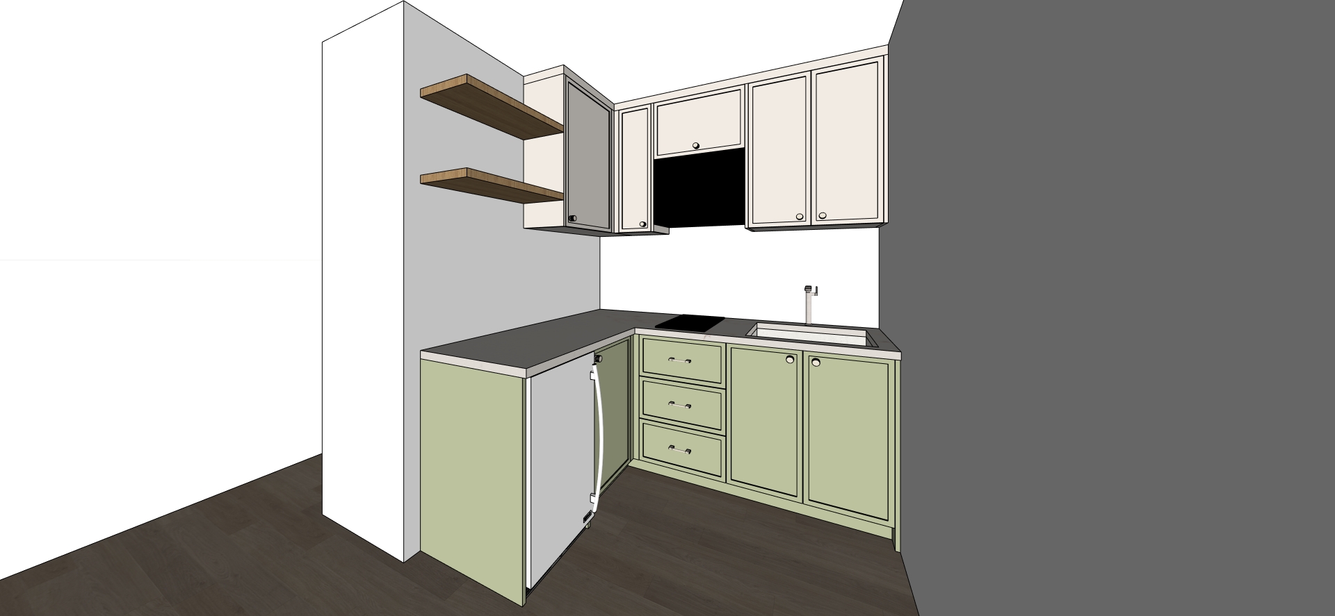 render a modern l shaped kitchen with a soft warm atmosphere use pastel sage green for the lower cabinets and a creamy light beige for the upper cabinets the countertop is a warm tajima hal marble door knobs and handles are brushed nickel kitchen faucet is brushed nickel add dray rack incorporated to the 24 kitchen sink bowl incorporate natural wood texture for the floating shelves and a sleek silver metallic finish for the fridge handle and fixtures decorate the floating shelves with some plants books basket and mugs the floor is a natural oak wood for a cozy feel walls are white eggshell painted enhancing depth set the lighting to soft and ambient creating a welcoming and stylish space