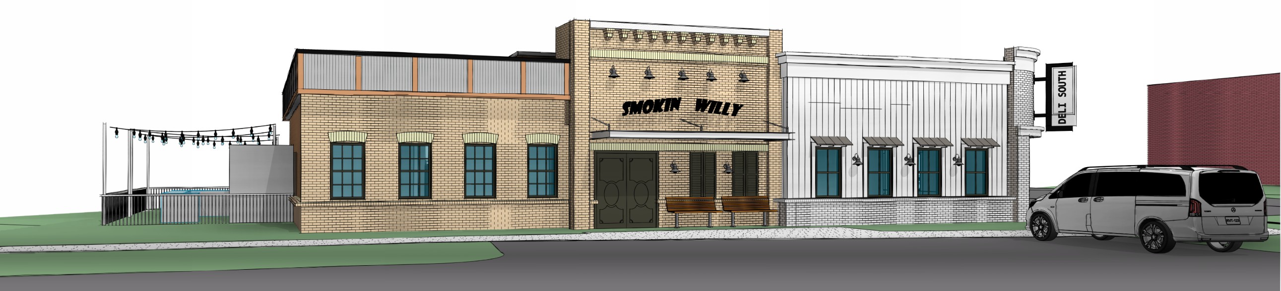 render restaurant at the golden hour with people on the sidewalk and landscaping along the building the name of the restaurant in the center should say smokin willy in the font in the image attached the building architecture and angle should stay the same