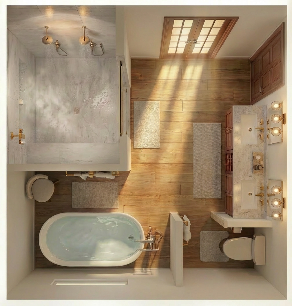 photorealistic enhancement of the provided architectural render preserve the exact architecture layout materials furniture placement and fixtures from the original image with no redesign or modifications the purpose is only to improve realism and lighting quality render as high end interior photography using a full frame camera with a 24 35mm architectural lens balanced exposure realistic dynamic range subtle depth of field and natural color grading the image should look like a professionally photographed luxury interior rather than a computer render soft natural daylight diffused window light global illumination balanced exposure do not change architecture do not change materials no redesign no new objects no additional lights no glowing fixtures no light from shower heads or faucets no dramatic shadows no surreal lighting no warped geometry no stylization