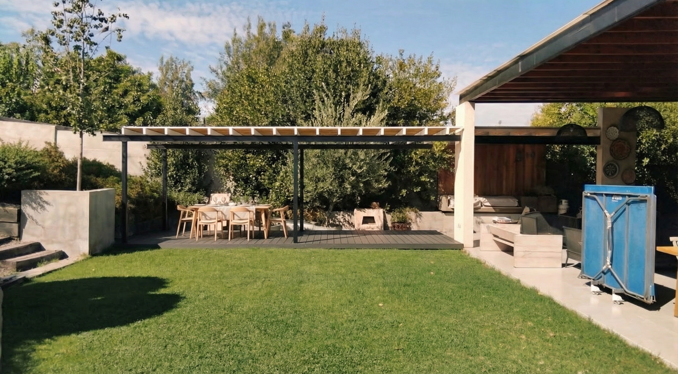 the dark grey pavement on the right side must appear lighter matching the tone of the pavement on the left side the black columns in the back row should not be visible keep the front black columns visible and unchanged slightly darken the white beams