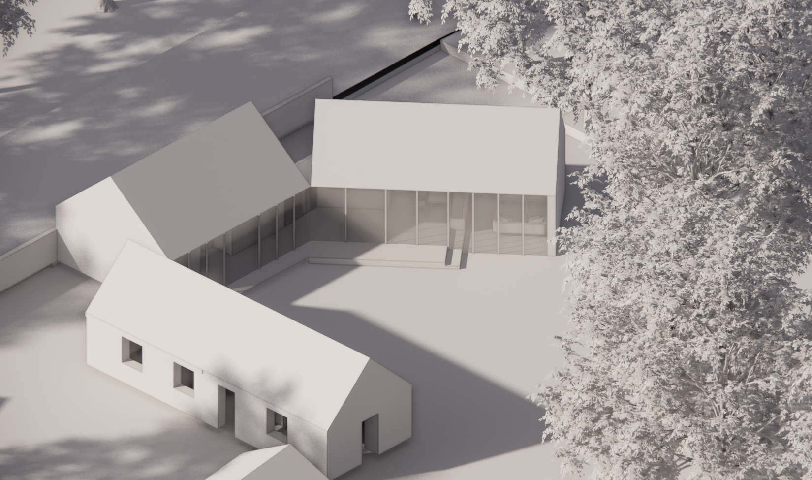 modernist exterior shot rural courtard with simple irish cottage and modern glazed extensions surrounded by trees the central courtyard is planted with grasses and ferns with a patio area for sitting in the sun architecture