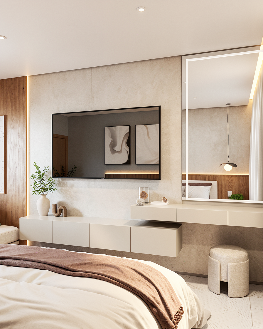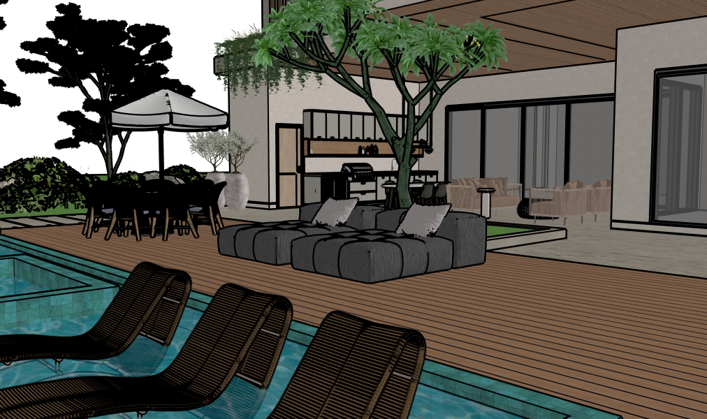 modernist exterior shot photorealistic architectural visualization render of a modern luxury backyard patio and pool transform the provided sketchup style linework into a fully rendered scene replace all sketch outlines with realistic materials and lighting while preserving the exact geometry layout and camera angle contemporary house with large sliding glass doors and covered terrace warm teak wood deck with visible wood grain and subtle weathering clear turquoise pool water with realistic depth caustics ripples and reflections three dark woven in water loungers in the foreground central low modular outdoor sofa in charcoal outdoor fabric with light linen cushions sculptural tropical tree growing through the deck with lush green canopy and detailed leaves outdoor dining set under a large white umbrella on the left built in outdoor bar and grill with stone concrete countertop and stainless steel appliances indoor outdoor lounge seating visible through glass ultra realistic pbr materials high detail textures accurate scale crisp edges realistic glass refraction and reflections global illumination soft shadows subtle ambient occlusion golden hour cinematic lighting warm sun direction consistent across the scene gentle rim lighting hdr depth of field with bokeh background wide angle architectural lens clean upscale resort mood no stylization no sketch effect no lineart no watercolor no toon shading no extra objects no layout changes no perspective change no warped geometry high fidelity photoreal render output architecture