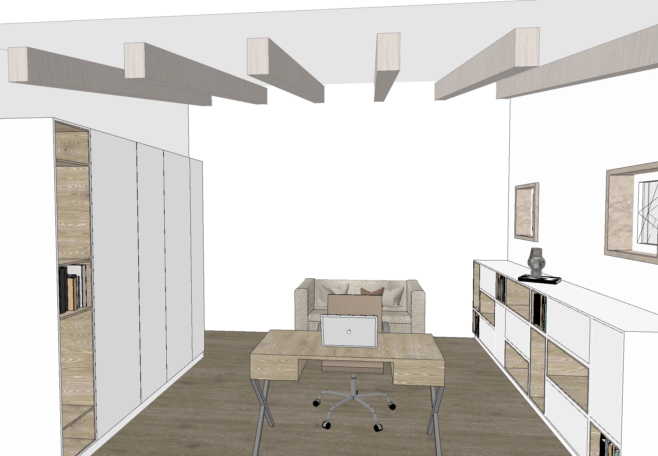 realistic photo of a home office in daylight bright and welcoming atmosphere white walls ral9016 white built in cabinets ral9016 open shelves in light non red or non yellow oak wood wooden desk in a light oak with chrome legs light white semi transparent curtains ergonomic vitra desk chair with light leather upholstery and chrome frame white ceiling beams jab taupe fabric sofa folded keeps the position as it is decorative office elements such as books binders and vintage accessories macbook laptop notebooks crystal water glass and coffee cup on the desk warm 2700 k lighting harmonious composition tidy and elegant workspace with a cozy lived in feel no orange or yellow wood material look wood is more stained