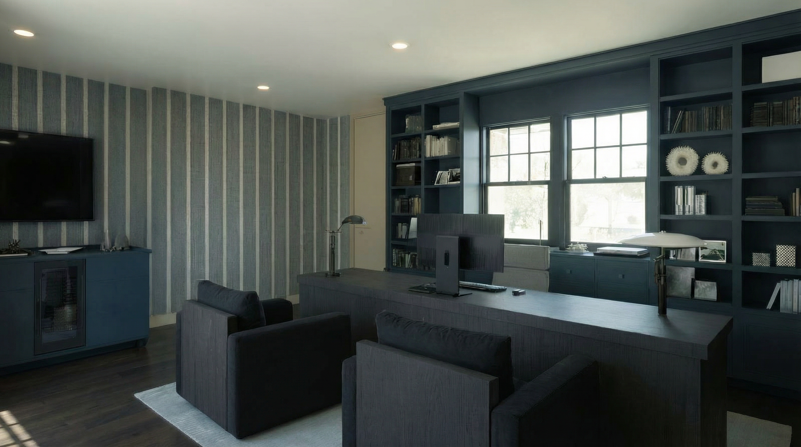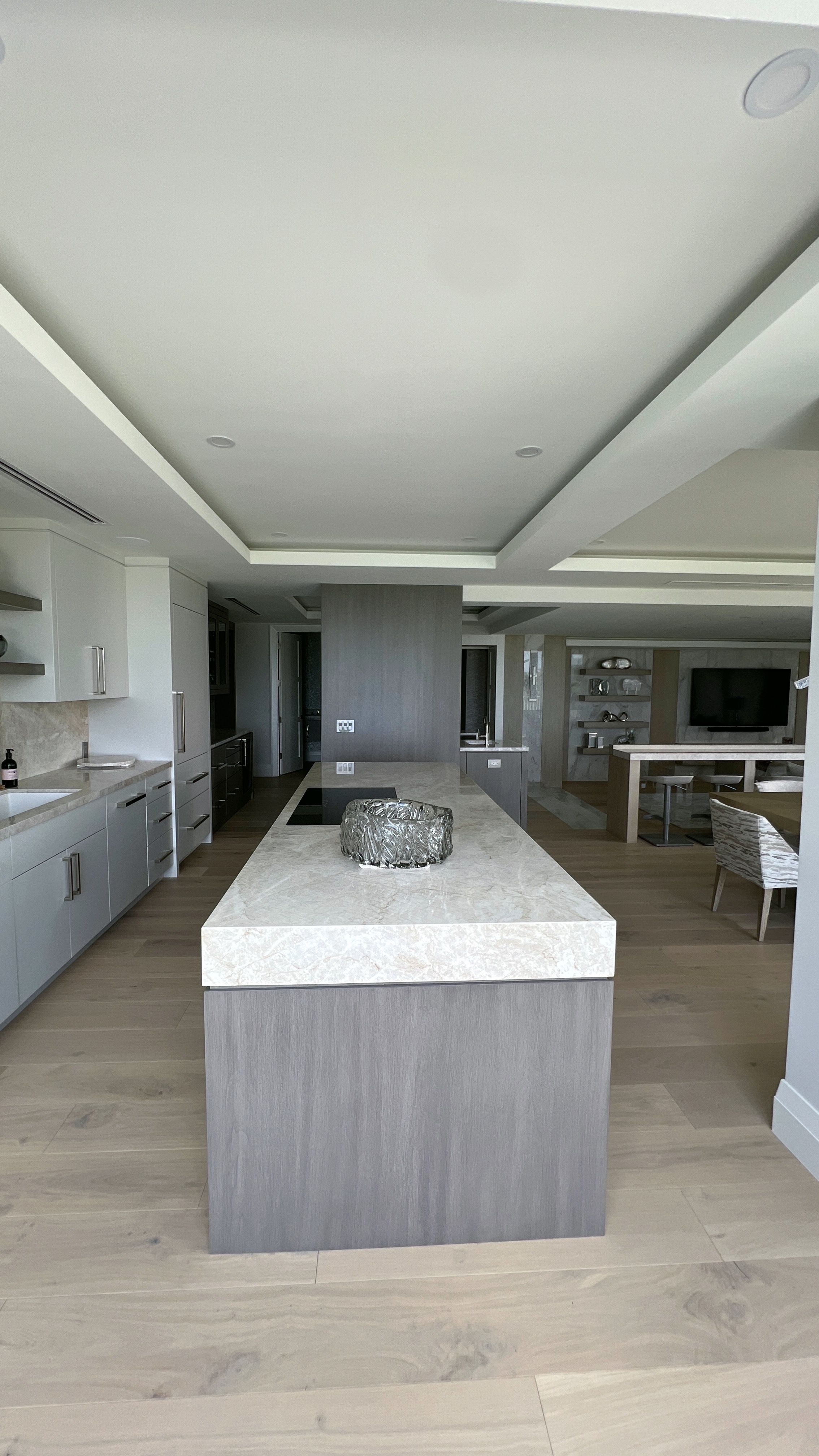 make this look editorial fix the angle and add an ocean view through the windows refined textures natural ambient lighting architectural depth soft shadows balanced proportions high end naples interior design style elegant and calm mood keep the exact geometry layout and design of the original image only upgrade materials lighting texture and realism render with an editorial sophisticated serene and high end aesthetic consistent with j lynn design group shot with natural soft daylight clean highlights subtle reflections realistic shadow depth and a 35mm interior lens feel fine grained detail micro shadows natural depth of field soft lens falloff true material reflection warm ambient occlusion museum quality lighting maintain exact structure silhouette and spacing from the original wall design remove any glare fix lighting and exposure