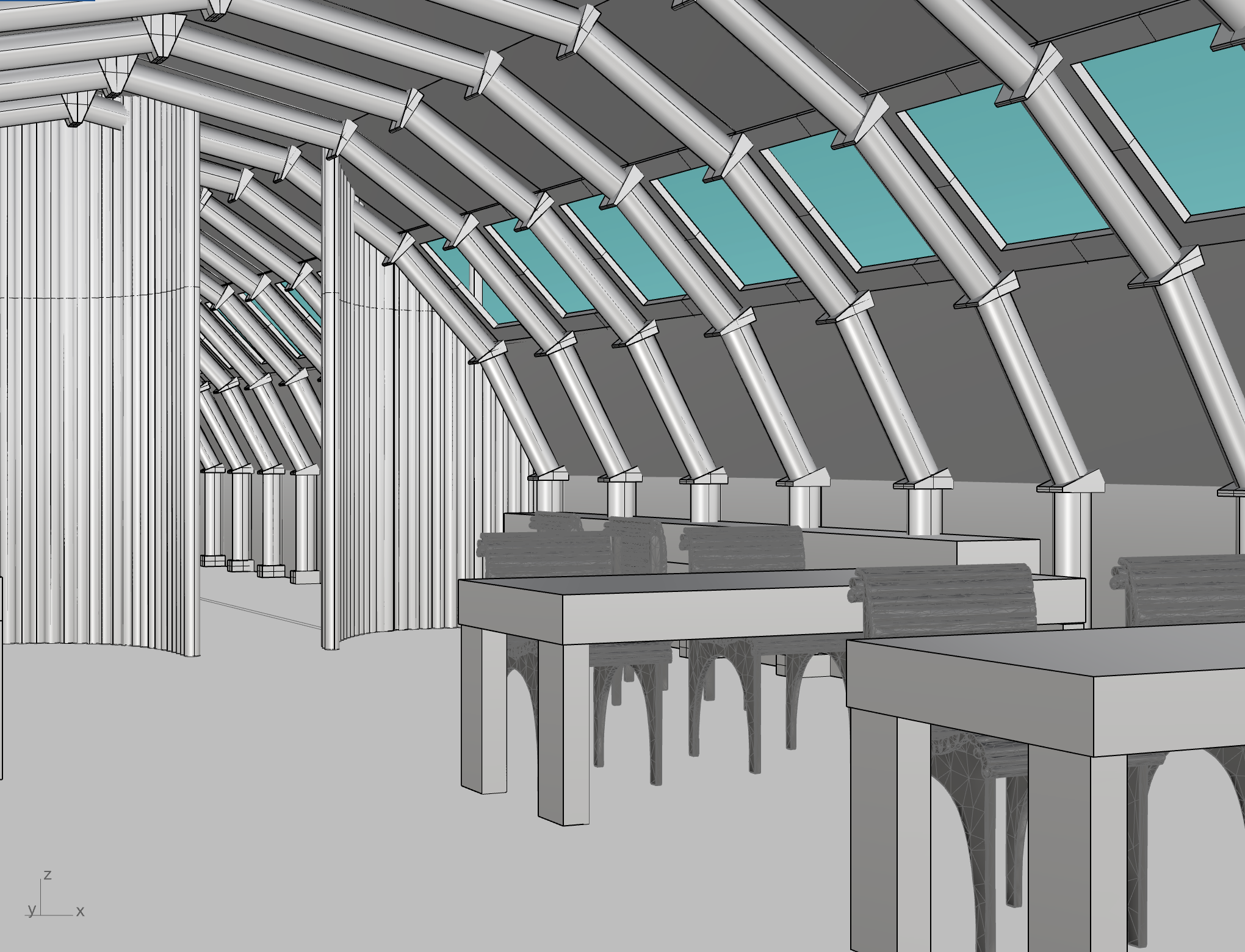 watercolor render of wooden structure realistic the blue windows let light come through the wall in the back is wooden poles the architecture is inspired by shigeru ban and the chairs are shigeru ban carta series
