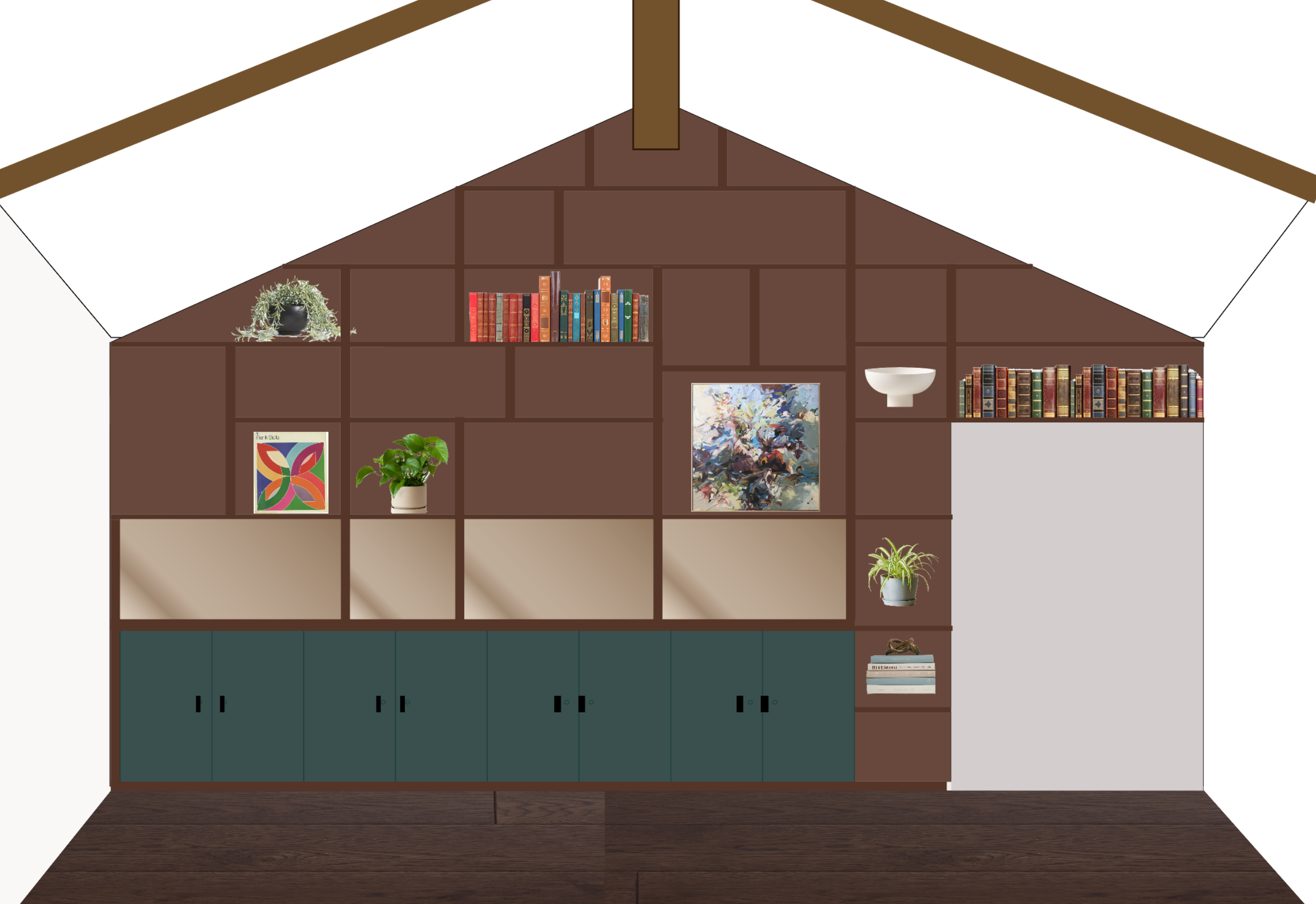 walnut wood wall behind painted teal cabinets