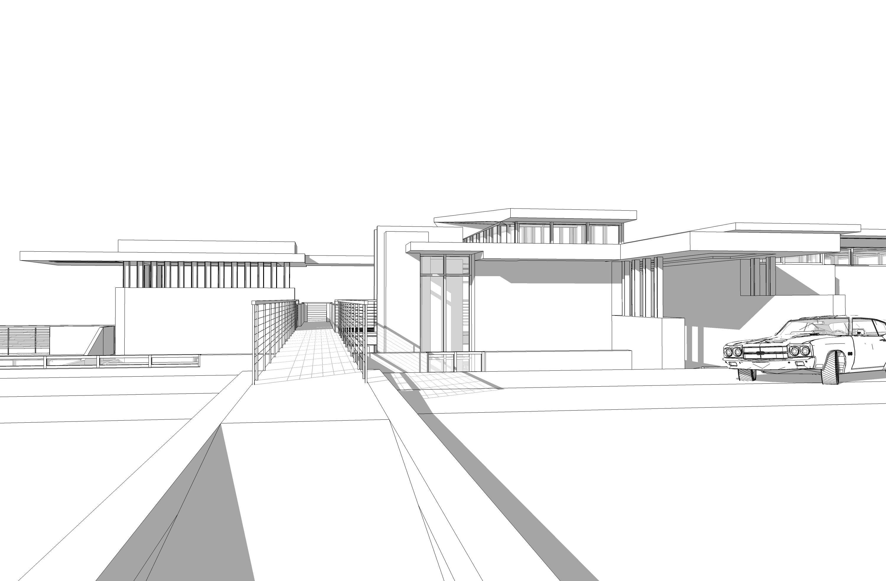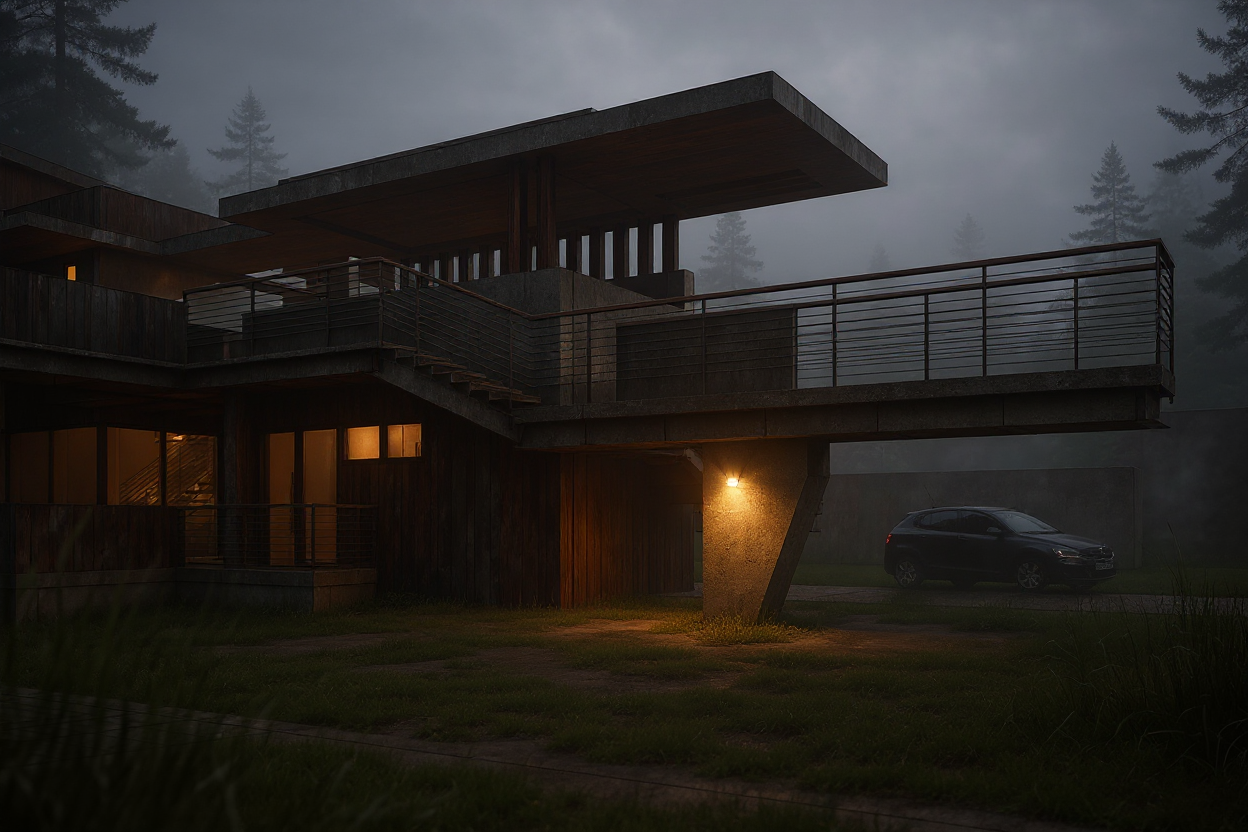 rustic shiplap siding corten steel panels with concrete accent walls sunlight on building face gloomy fog day tall grass foreground