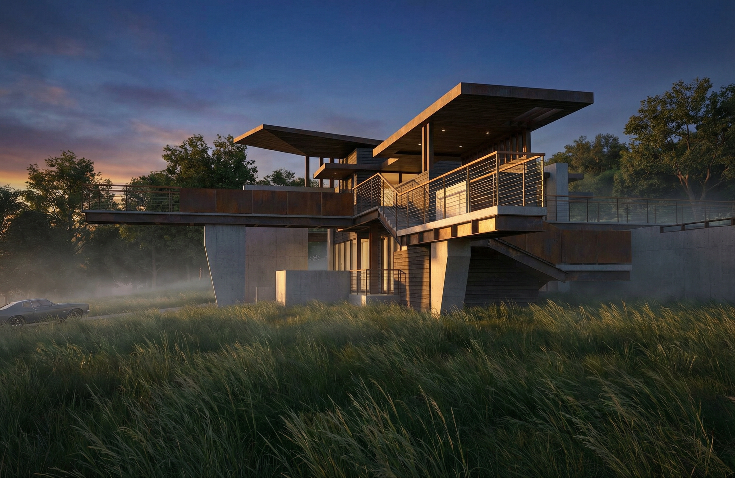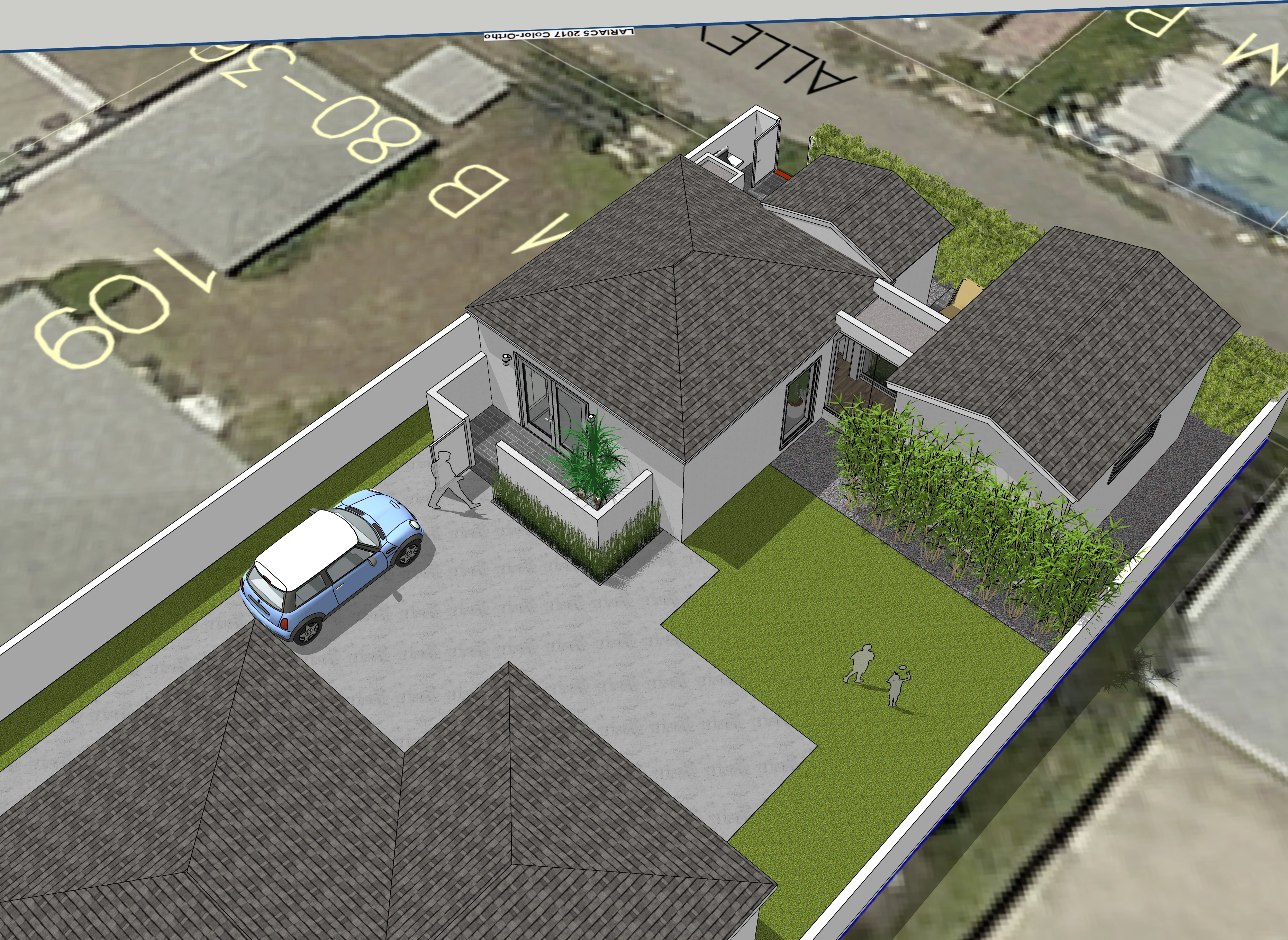 add trees on the other side of the wall at the left side of the view make the driveway look like decomposed granite add some california wild flowers to the yard late afternoon sunshine with some clouds in the sky add a woman walking through the gate into the house