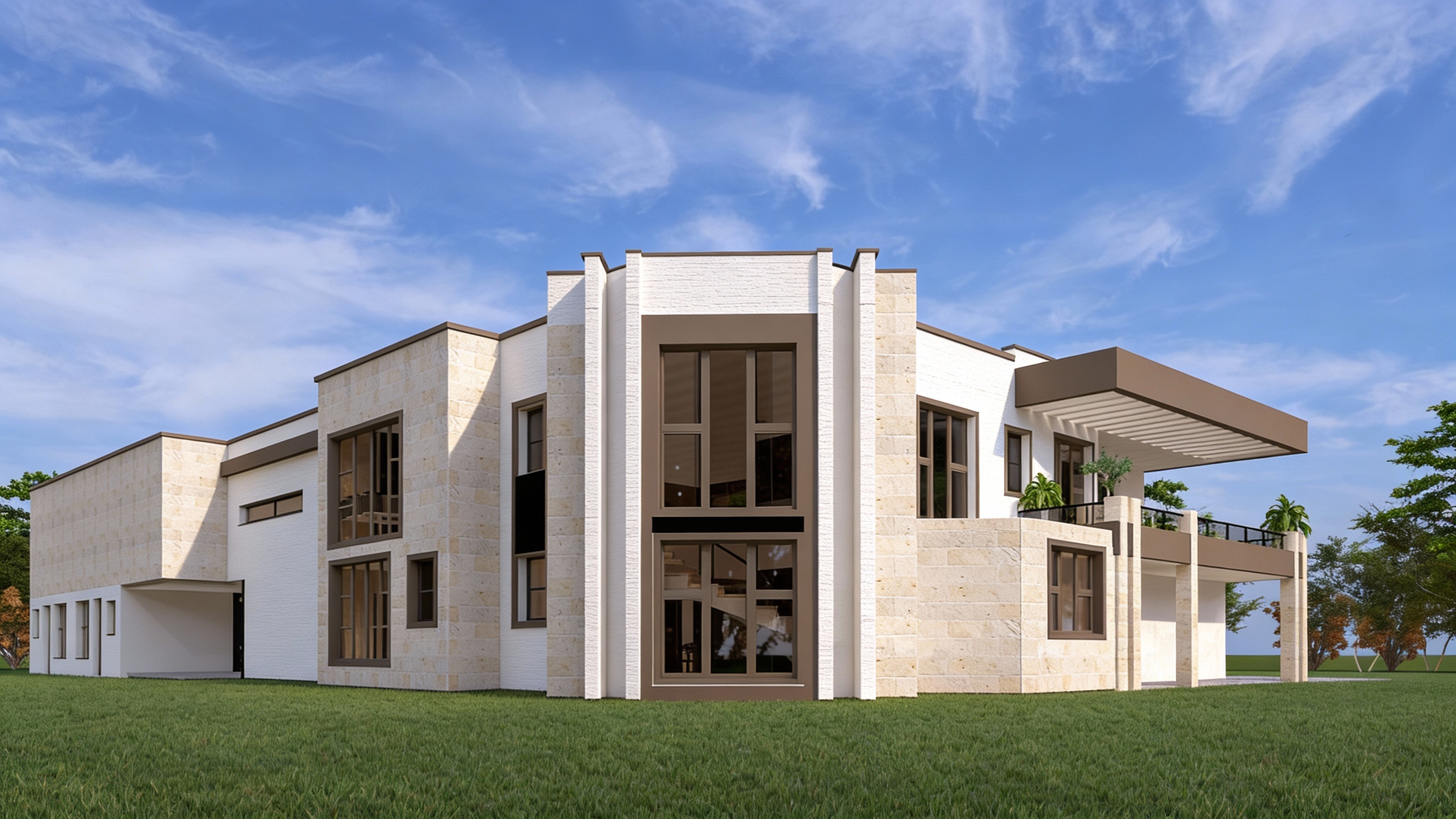 create a three story building that blends contemporary architecture with japan s meiji era aesthetic incorporating modern elements such as vertical and horizontal louvers clean lines and refined materials strictly preserve the camera view and the building form shown in the reference image and do not alter them in any way