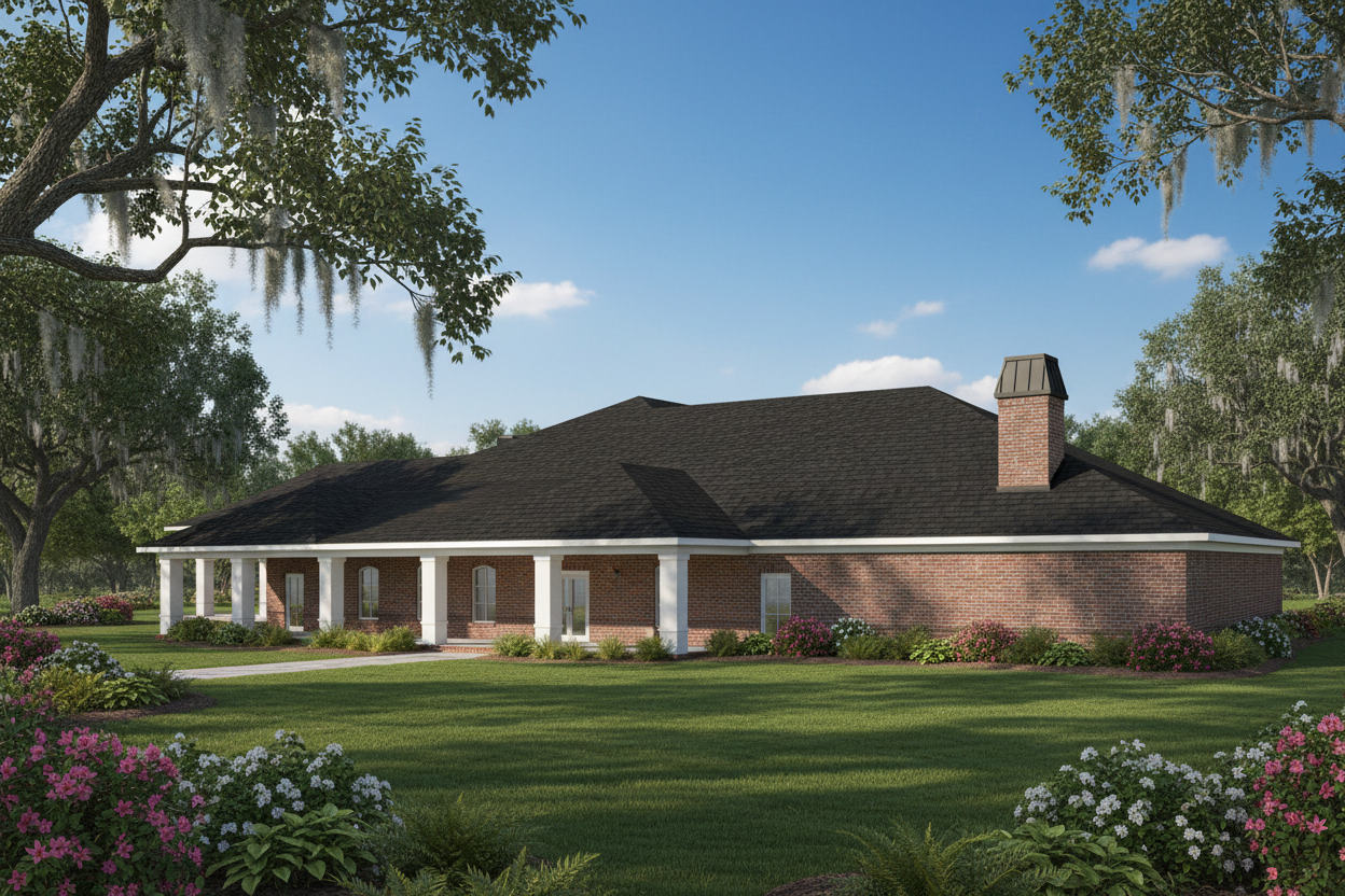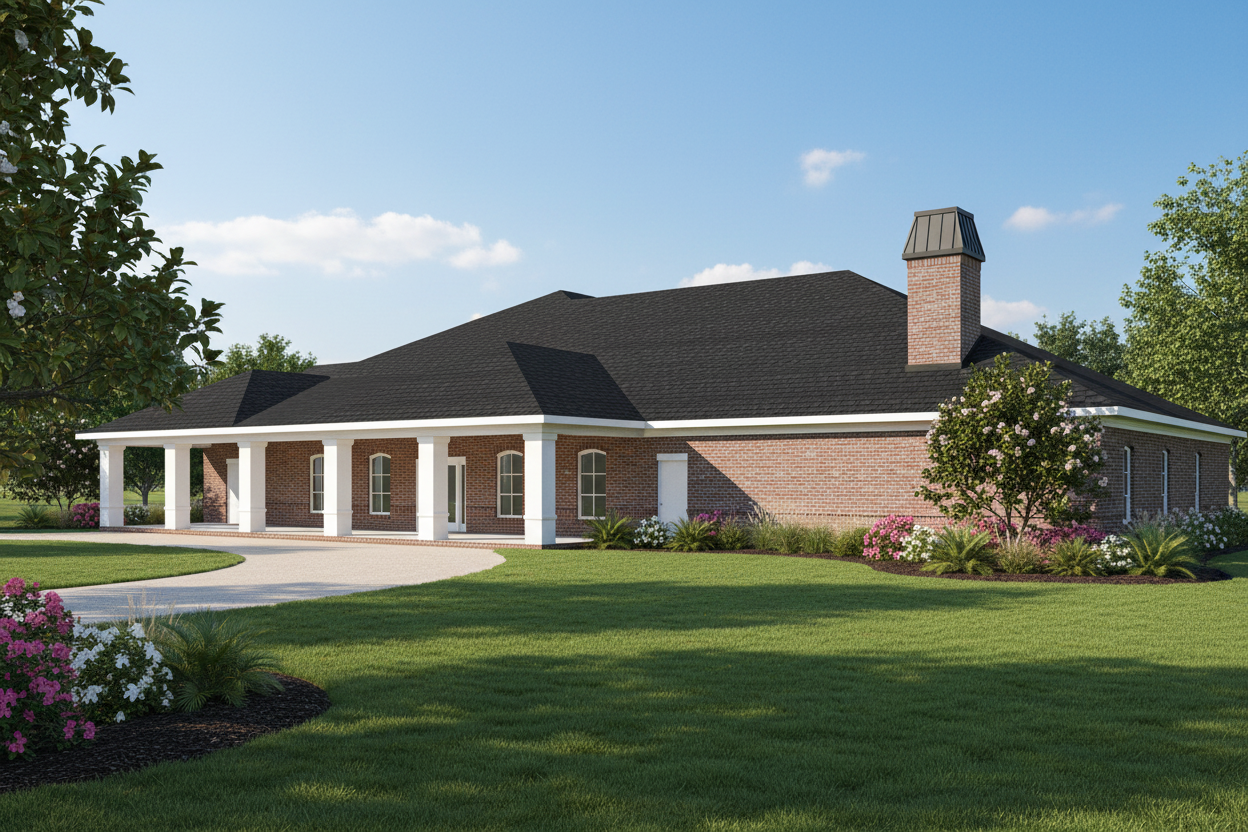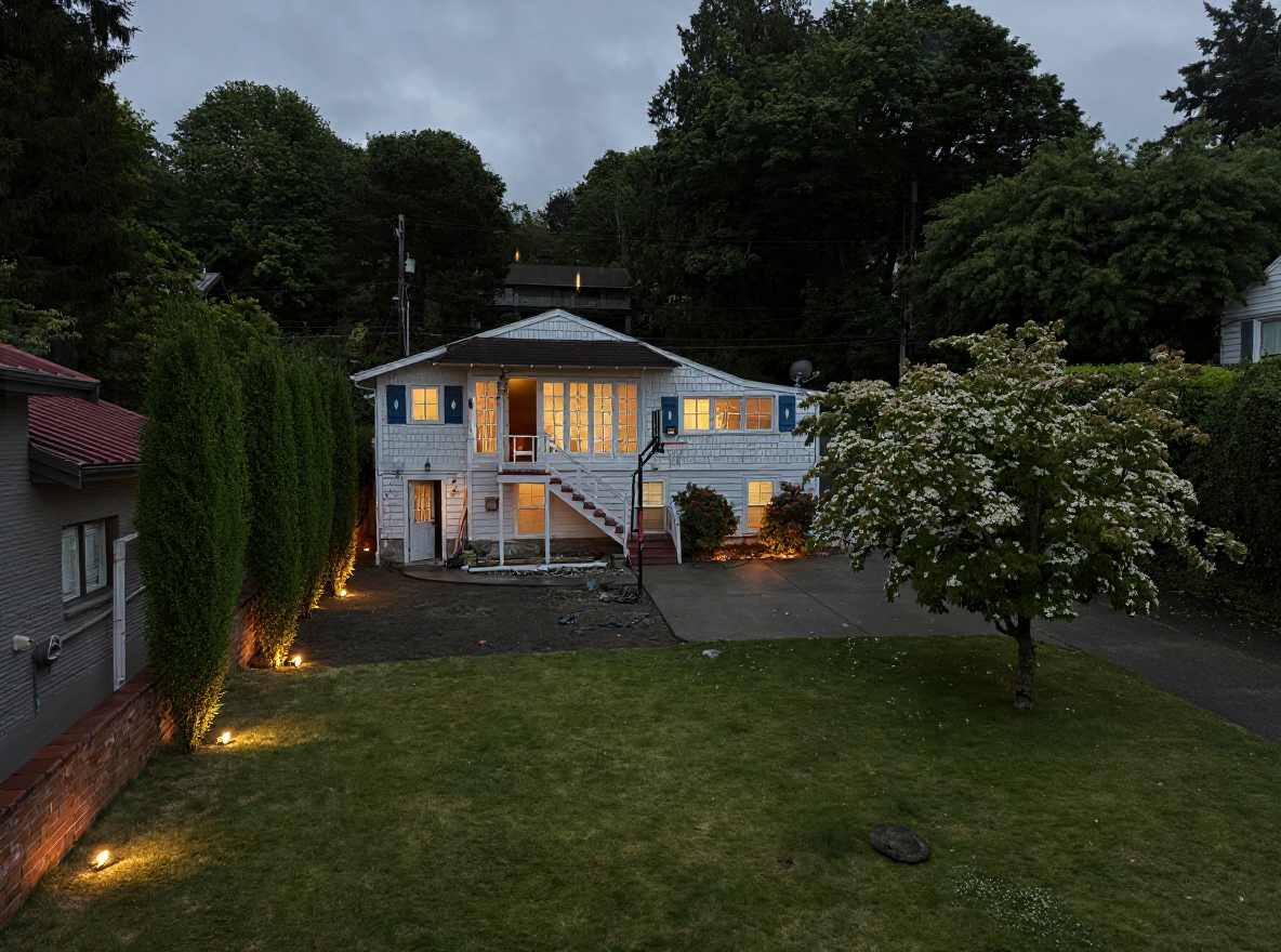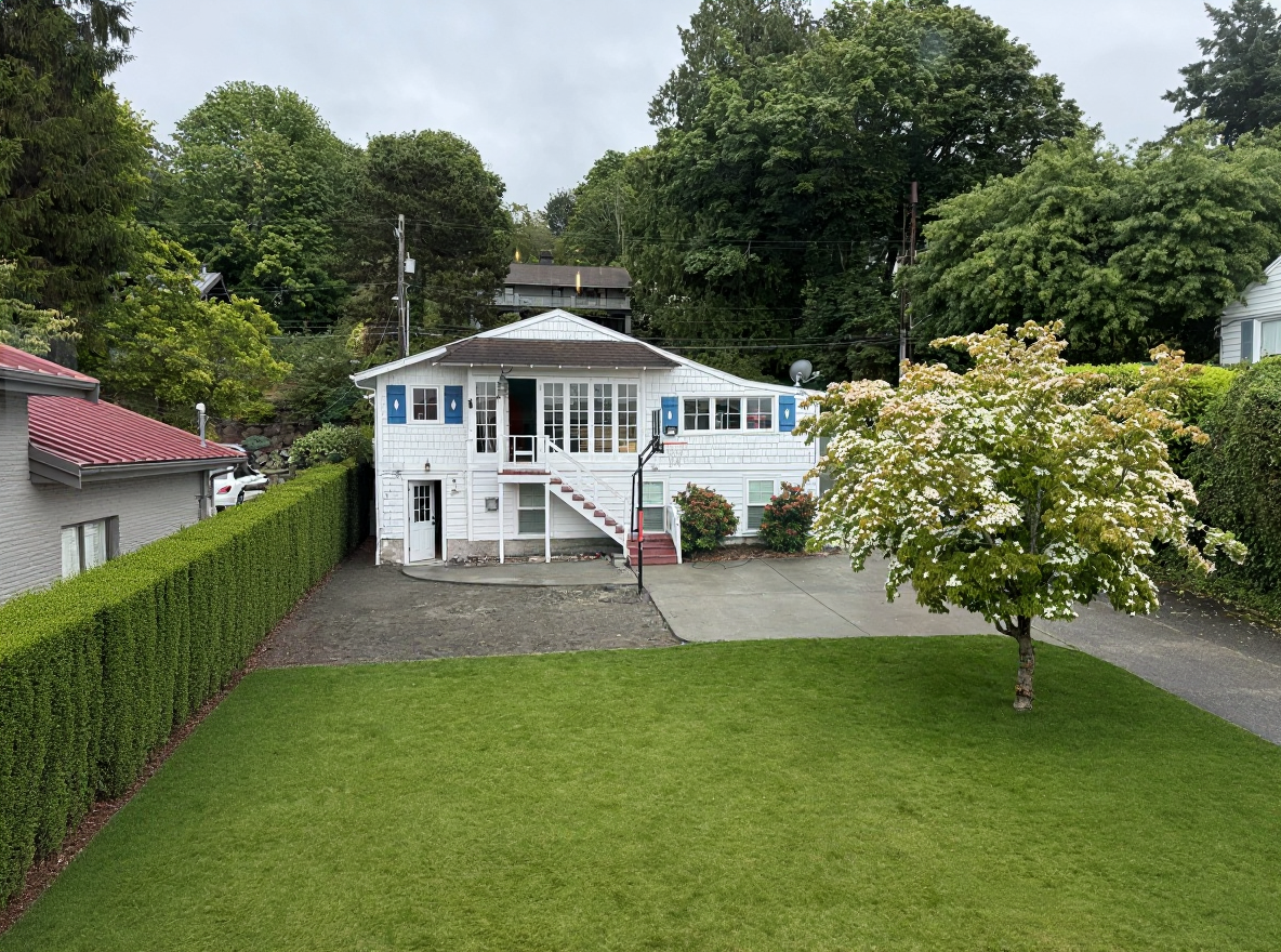 change image to modern house and landscape remove objects from the yard and put a continuous line of very tall trees along fence with a planter in front paint house white and replace blue shutters with wood shutters