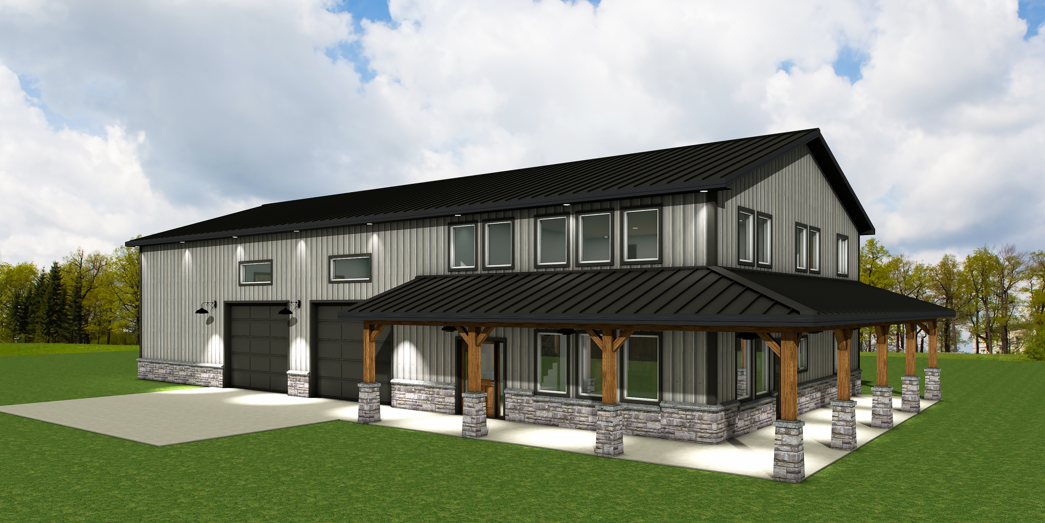 a modern two story barndominium farmhouse with light gray vertical metal siding black standing seam metal roofing exposed wooden timber posts supporting the covered patio retain the exact structure window arrangement patio columns balcony chimney rooflines foundation height and proportions exactly as shown in the reference image add a smooth concrete front driveway extending toward the house integrated naturally into the terrain surround the property with a lush dense forest of tall mixed evergreens and hardwoods place the sun behind the trees so warm golden sunlight beams through the branches casting soft rays and subtle dappled highlights across the patio siding and grass create ultra realistic lighting crisp shadows detailed textures in the siding and glass reflections and a vibrant clear sky with light atmospheric depth render in hyper realistic architectural visualization quality 8k resolution
