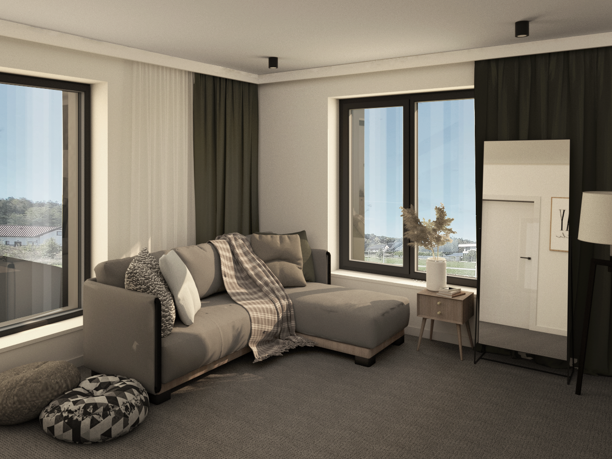 create an elegant and serene bedroom scene with minimalist scandinavian design the room features natural light streaming through large windows covered with warm dark grey curtains illuminating light beige walls add a neutral colored pouf on the floor a full length mirror with a black frame stands beside a small cabinet with personal items use dark gray curtains and sheer white drapes to frame the windows introduce greenery in a glass vase with subtle earth tones against the soft beige carpet the atmosphere is peaceful and airy with a cozy welcoming ambiance