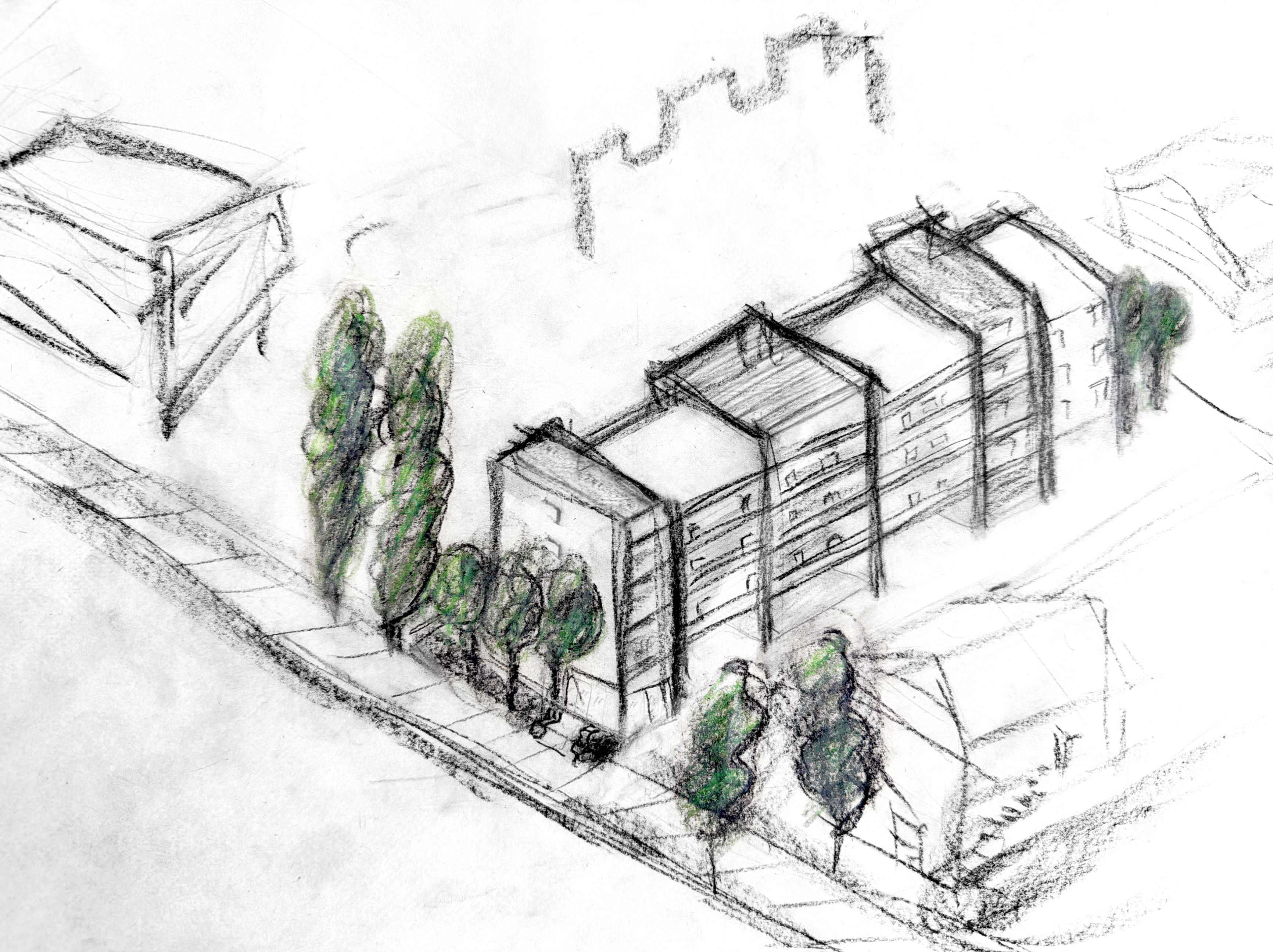 edit the style of this sketch to be more crisp and artistic architect charcoal sketch be sure to include the green underlay for all trees and vegetation to be clear with a color