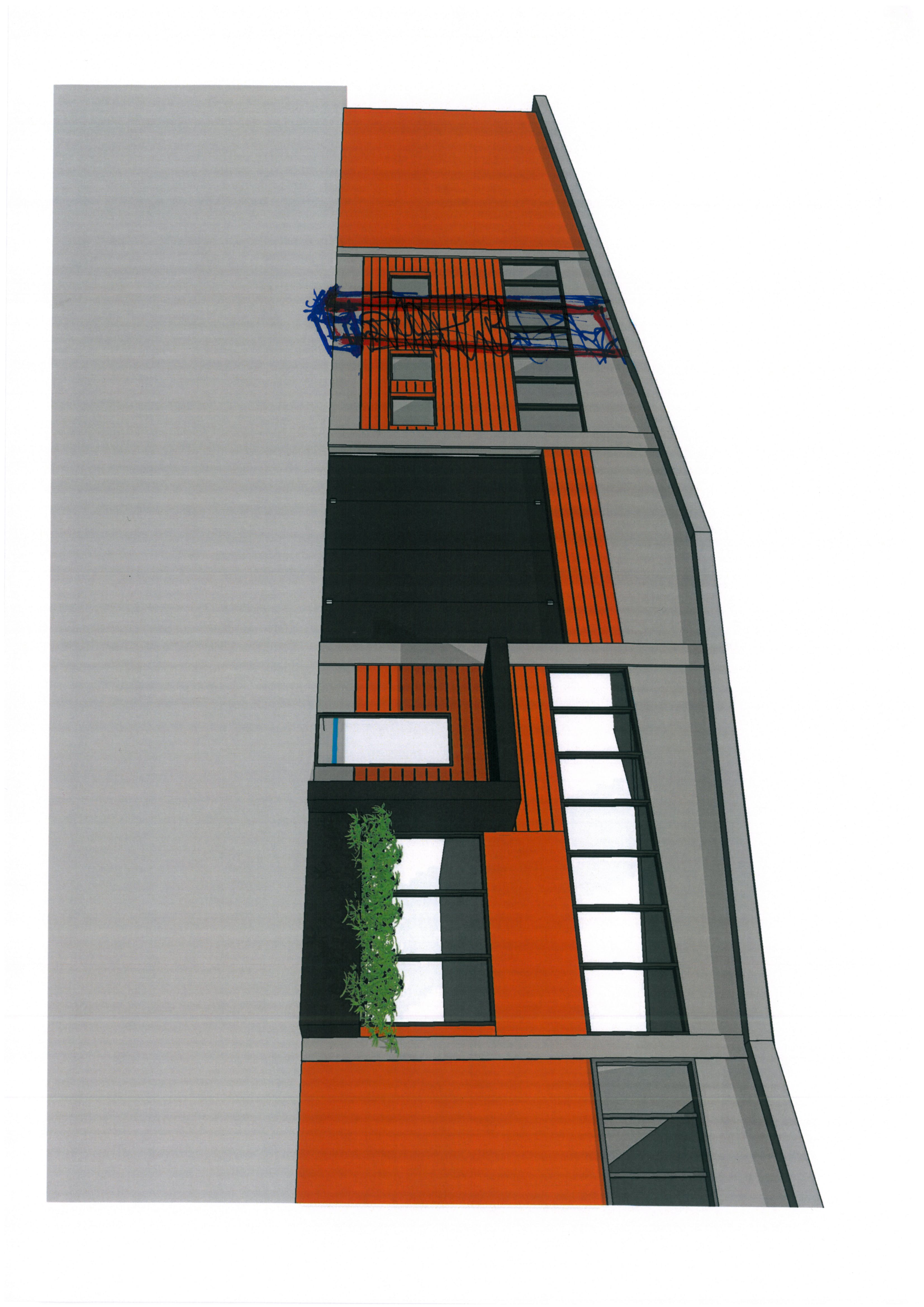 fammi una facciata moderna con mattoni color bianco avorio infissi con telai e portone color testa di moro anche la fioriera di destra e la pensilina di accesso in lamiera color testa di moro e poi fare sulla sinistra come da bozzetto a mano libera una fioriera con un totem inverdito con rampicanti e ivi inserito un logo verticale con la scritta multiprojecta la facciata del capannone color bianco avorio la campata di destra oltre il pilastro deve rimanere con laterizio color cotto e facciata grigia e anche tutta la porzione a sinistra oltre alla fioriera totem