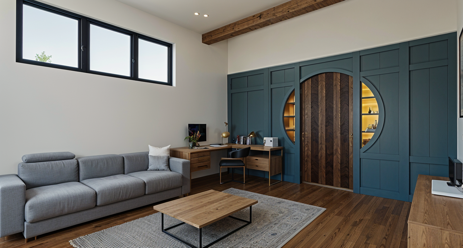 create a luxurious modern walk in closet with mirrored cabinets and dark wood accents the atmosphere is warm and elegant with ambient lighting casting a soft glow the cabinets are framed with gold trim and the room is filled with organized clothing and accessories a plush ottoman in the center is upholstered in rich tan velvet the flooring has a textured light gray pattern adding a subtle contrast to the darker tones the mood is sophisticated and refined evoking a sense of opulence and style i want top view and depth of 600mm from the wall