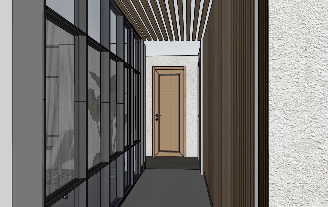 make flooring a mid grey plain office carpet add crittal film to middle pieces of glazing make door at end flat ash wood with no panelling add timber slat wall to right hand wall