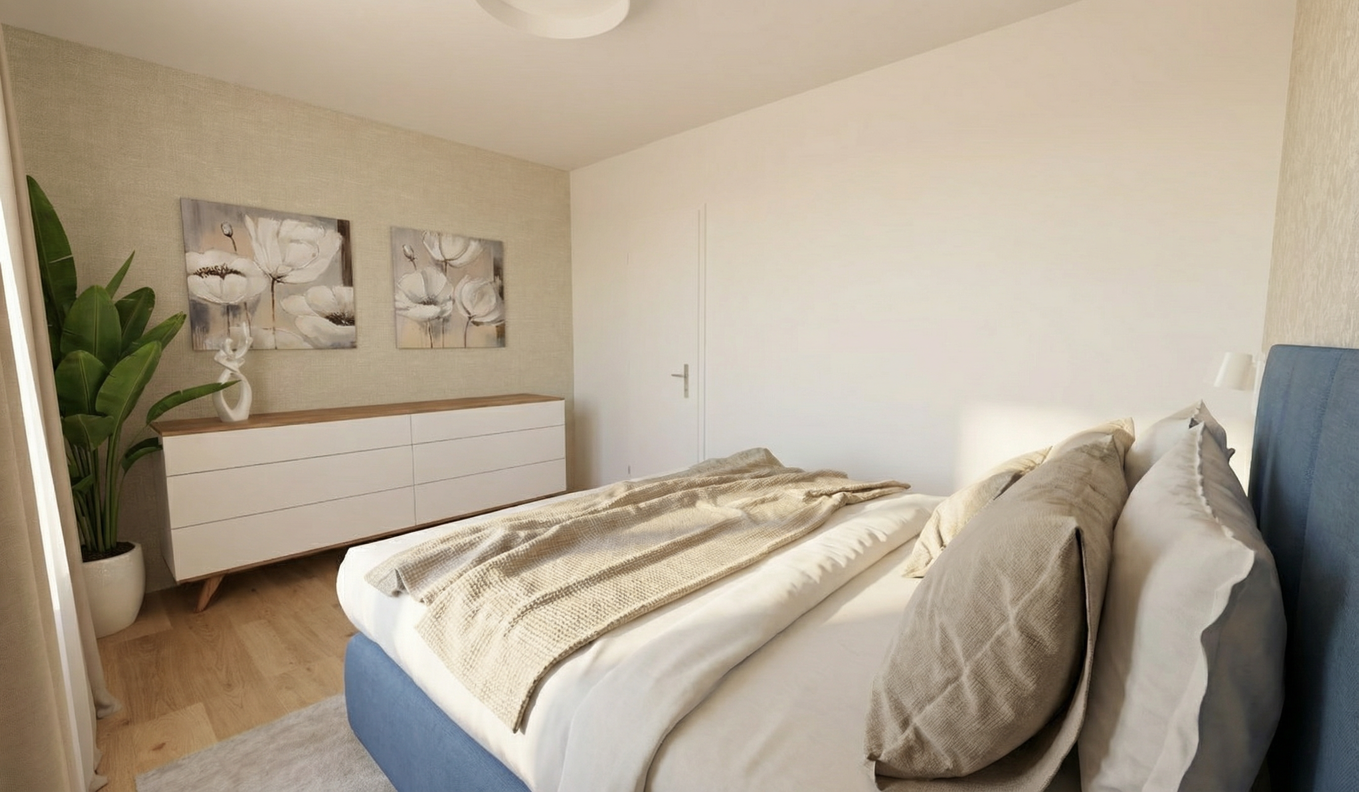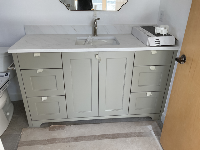 do not change the cabinets in any way preserve the exact cabinet colors materials finishes dimensions door and drawer styles hardware spacing alignment and all geometry exactly as shown do not alter the countertop shape backsplash appliances flooring lighting fixtures or wall structure only remove the construction materials clutter and mess from the scene clean the room and make it look finished and staged add a few simple tasteful home accessories appropriate for the style of the space but do not add or remove any furniture windows or architectural elements maintain the original lighting direction and realism enhance clarity and polish the photo while keeping the cabinetry and room design completely unchanged do not alter the lighting to keep the cabinet colors as they are in the image add new flooring remove the reflection in the mirror remove the door on the right stage the countertop for a bathroom add brushed nickel pulls to the door and drawer fronts