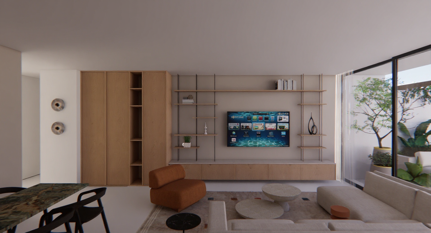 add daylight coming through french doors and art above the sofa add decor and drink bottles on the bar cart on the far left corner and have the barcart in chrome with glass shelves the rug is wool and has a little texture add two 29x29 square pillows and 1 12 sphere pillow on the sofa