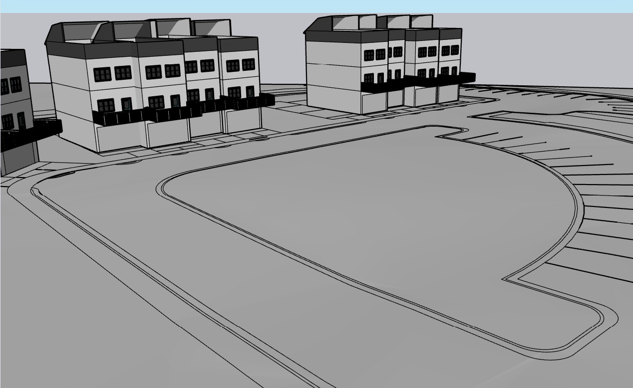 manicured lawns in front of these townhomes tallish grass each townhome needs to be wood light wash with a darker brown roof there is an outlined driveway infront of eachtownhomes garage and infront of the row of townhomes there is an outlined sidewalk and road the plantings need to be yellow green flowing trees south georgia type plants the large open area in the middle needs to be an open fenced in dog park area with people inside of it and parking surrounding it the road surrounds this outliend dog park area and contineus infront of the townhomes
