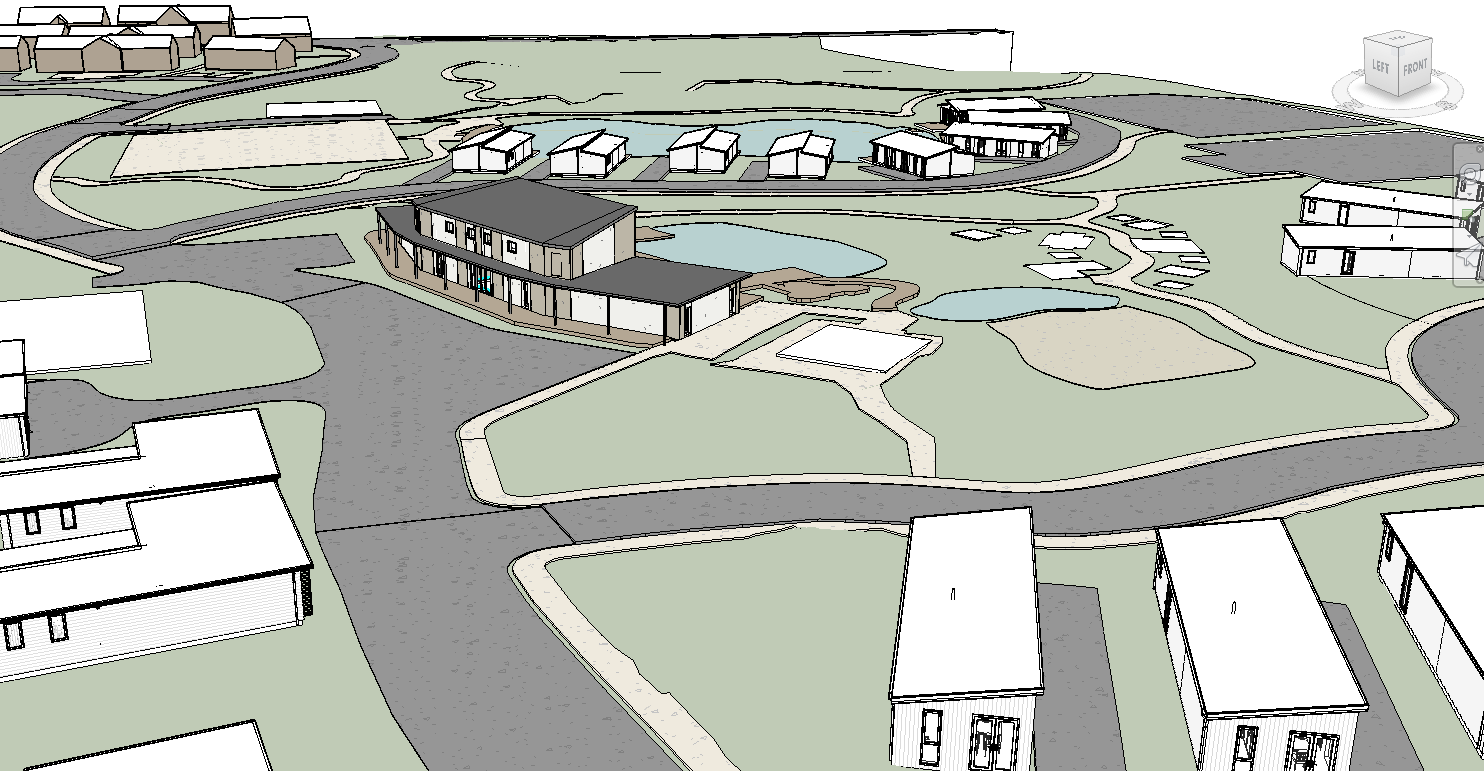 create a realistic architectural render of the image the image should depict a picturesque holiday park in the english countryside the park contains lodge style homes which are clad in a mixture of balck timber and natural light coloured timber they are modern in appearance and have large windows in the centre of the park is a curved leisure building which is clad in a natural light timber and a cream render to the front of the leisure building there is a small lake with a childrens play area to the left the image should be set in early spring and the glazing in the image should be reflective