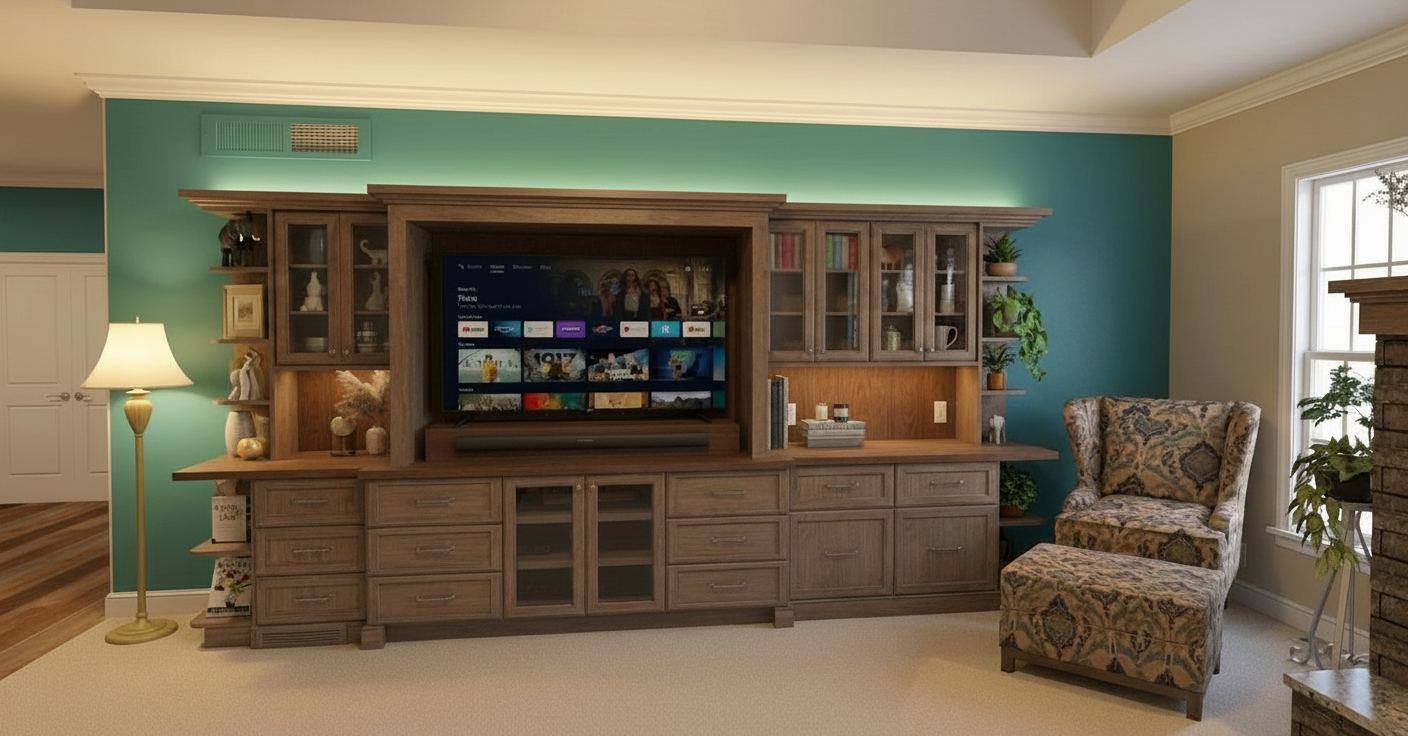 absolute rule keep all cabinetry and room geometry textures and finishes exactly as in the photo only add accent lighting to the upper glass front cabinets