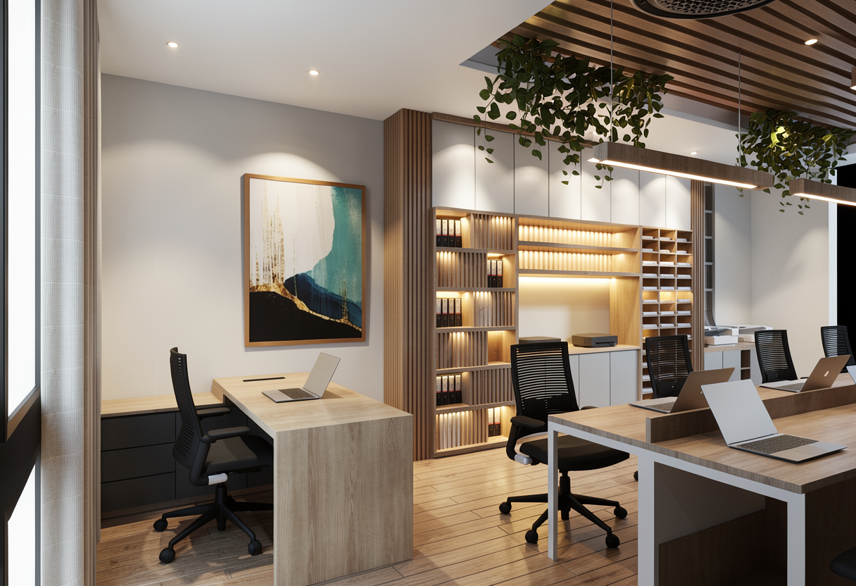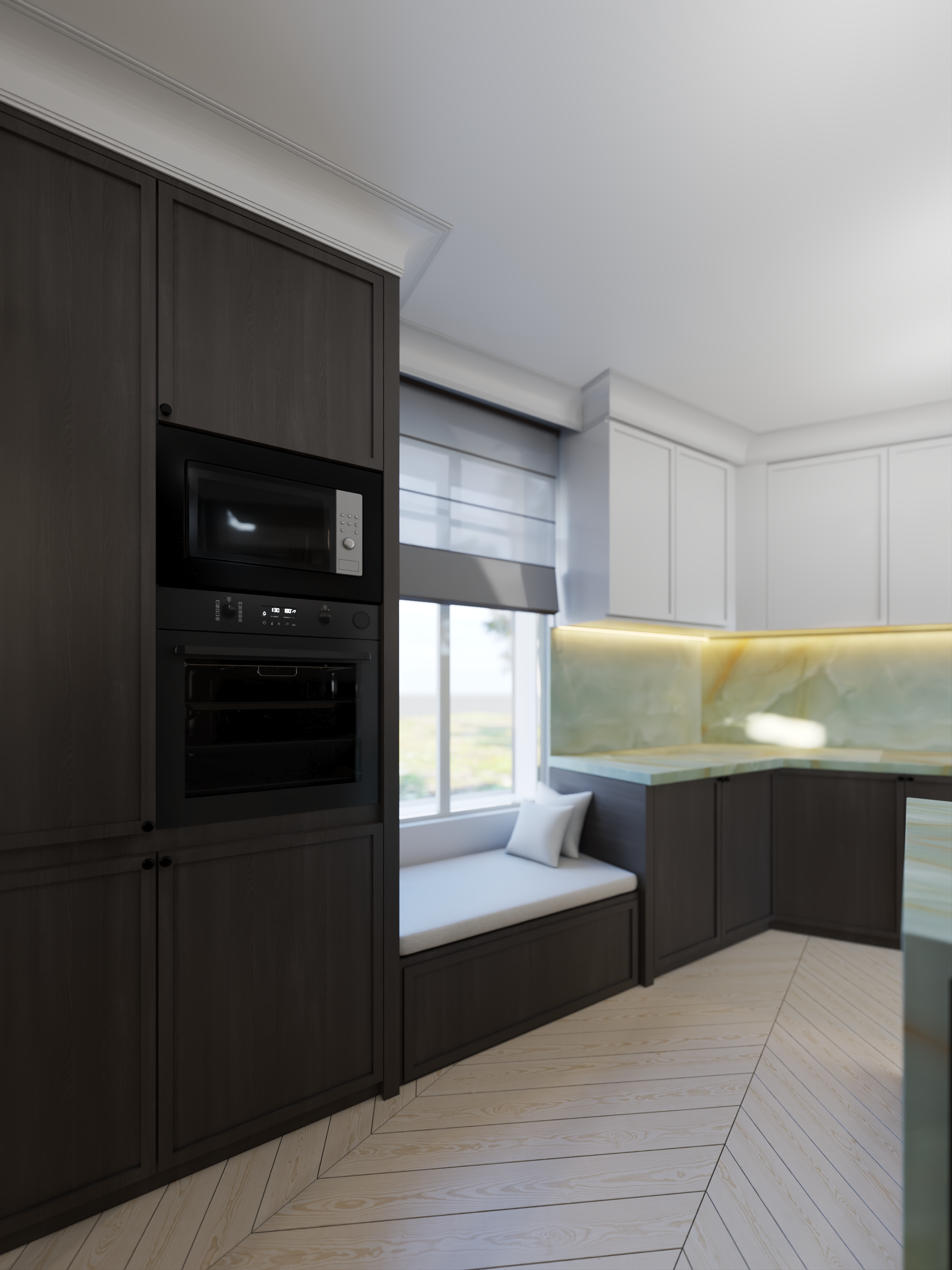 enhance the photo realistic texture and morning lighting set the interior lighting of the kitchen with soft artificial lighting setting under and upper of the cabinet enhance the realistic texture and dawn lighting with interior lighting turned on with soft light set the camera focus into f 35 focus on the table set