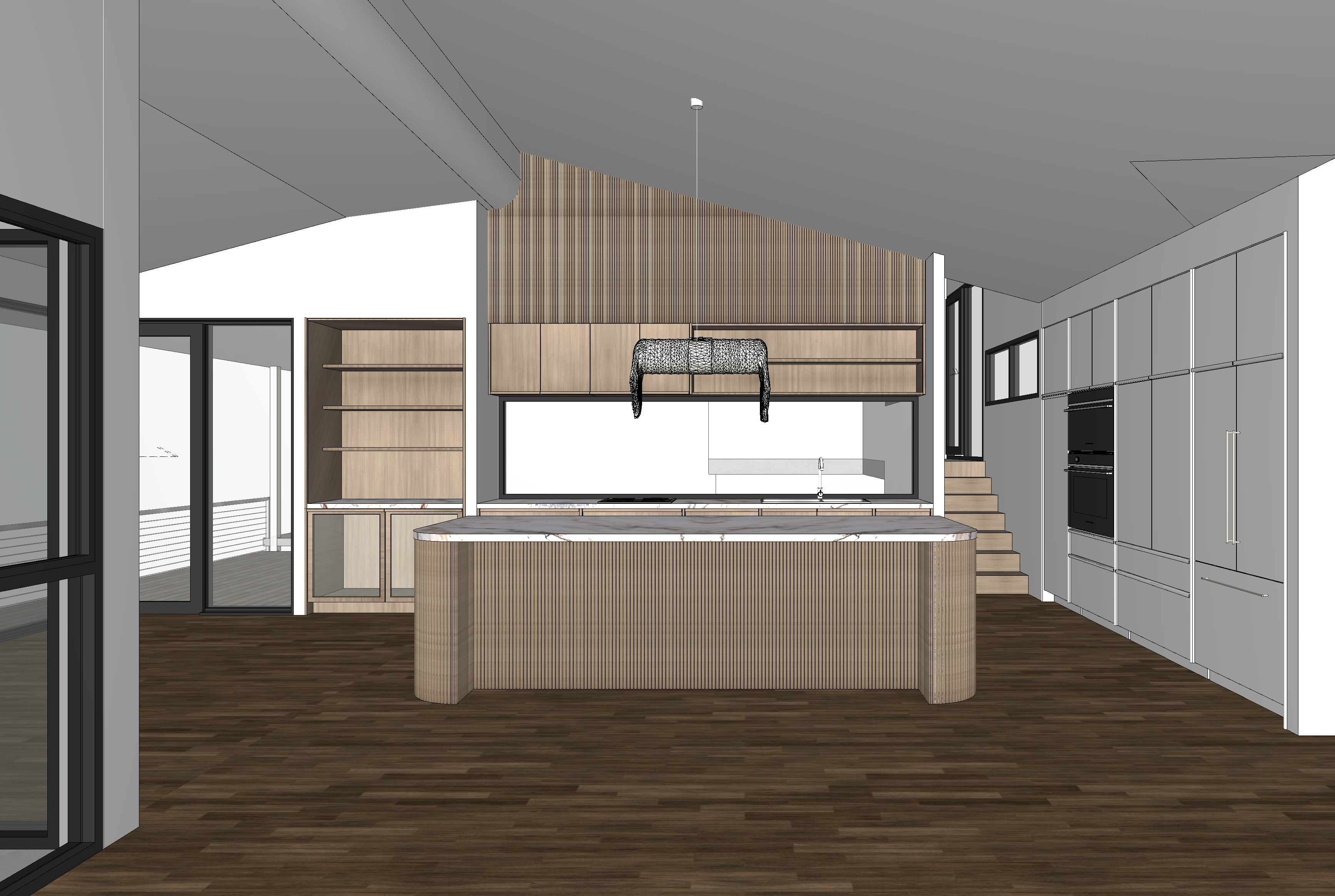 render this kitchen with nice floorboards and agreen lush australian garden in the background the light pendant is a japonese cloth pendant above the kitchen island cabinets on the left are to be white keep cabinets design excatly how they are
