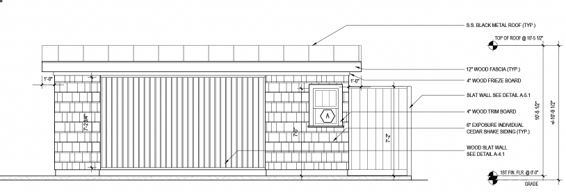 render this elevation but change the vertical slats to horizontal with an alternating pattern of 4 and 2 boards that align with the shingles
