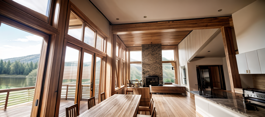 christmas party at sunset snowy mountains and pine forest out the windows
