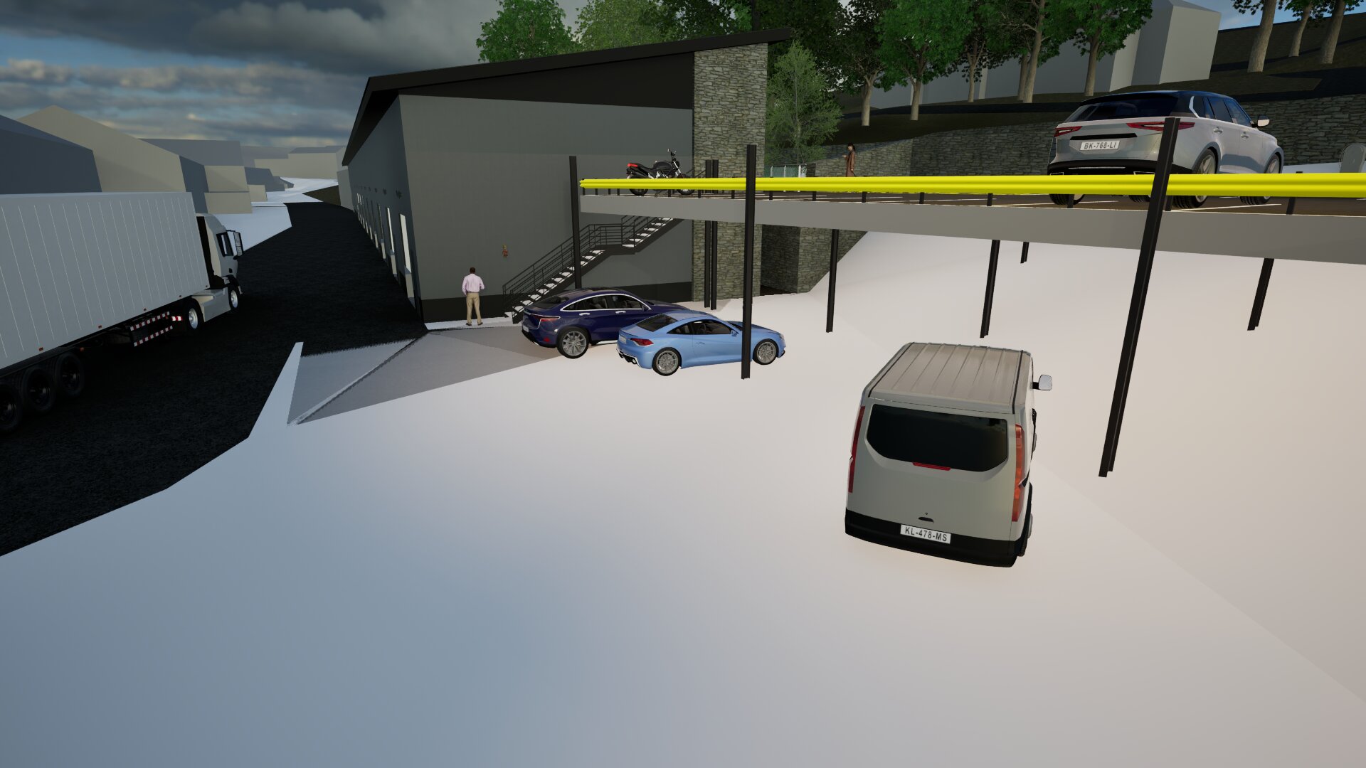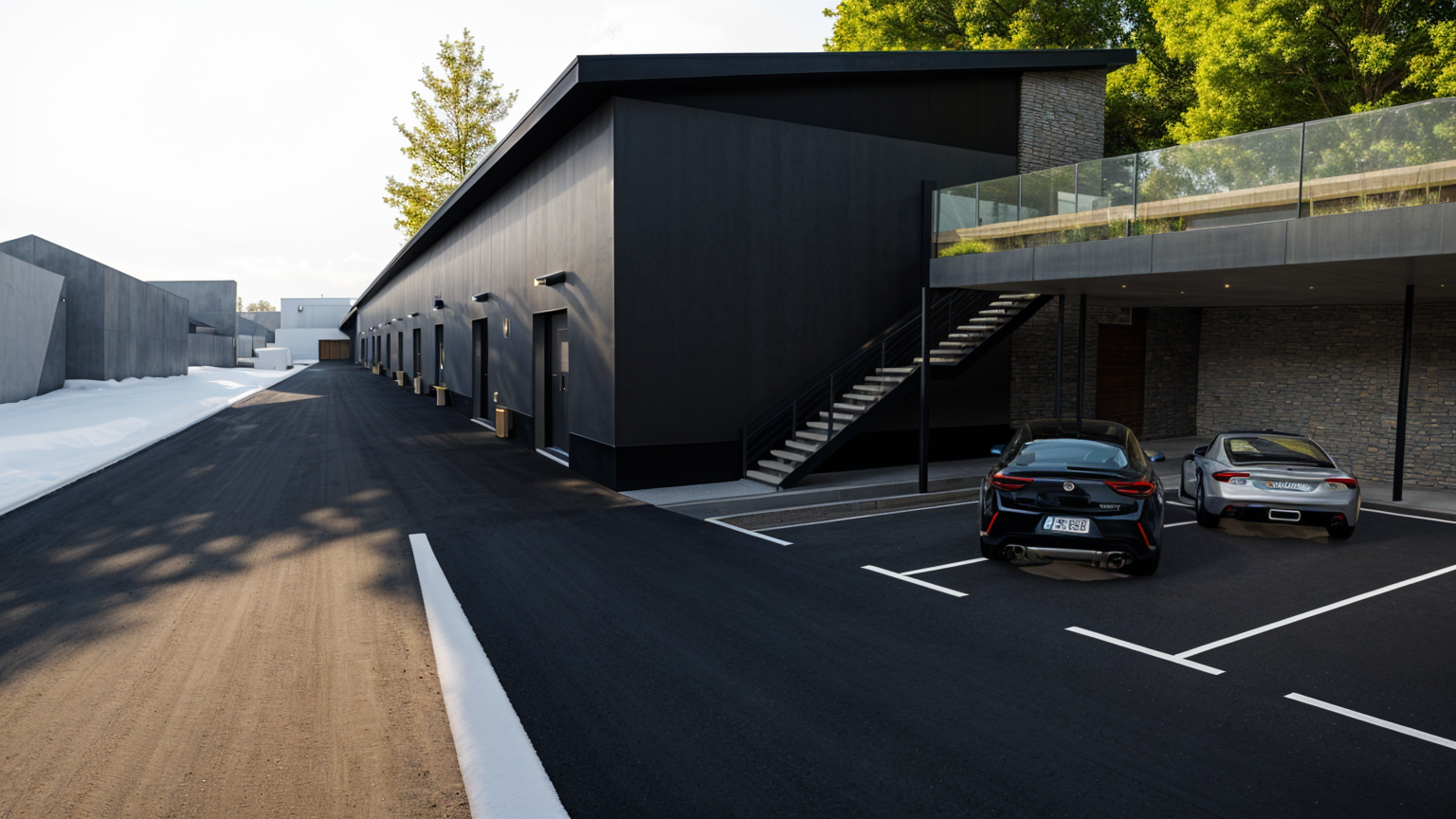 render a modern industrial parking lot with a sleek contemporary building on the left complemented by a lush green landscape in the background the building is a matte charcoal gray with subtle textures while the parking lot is smooth asphalt marked with bright white and vibrant yellow lines include cars of various colors such as deep blue shiny silver and vibrant red scattered throughout the parking spaces surround the area with neatly arranged stone walls in a light gray hue large full canopy trees rich in green frame the scene the atmosphere should be bright yet slightly overcast with soft shadows and diffused lighting creating a calm and orderly environment