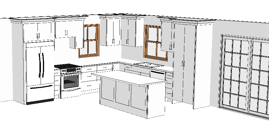 white kitchen shaker doors stools behind island wood plank floor