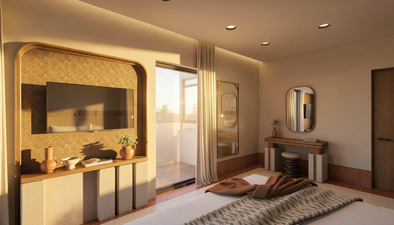 this is a house on top of small pond with small trees in the background the wall material is black burned wood please make it realistic and leave the landscape as it is the ground is dark brown with lush deciduous plants add darmera peltate plants under the house and around water leave the original structure i drawed the extent of the pond area in blue openings are in dark black