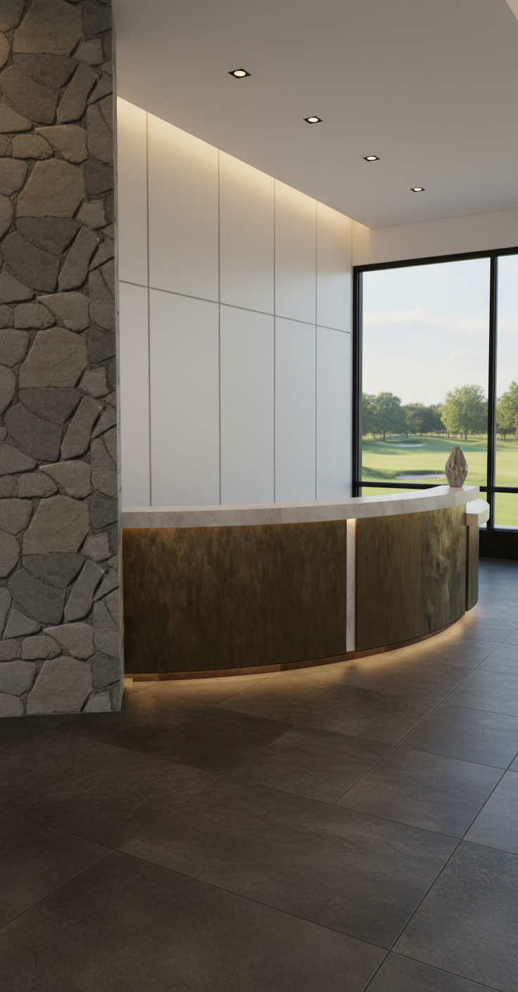 building with corrugated cladding each panel of cladding is on an angle soft daytime lighting with hazy clouds in the sky people walking by the foreground its dawn