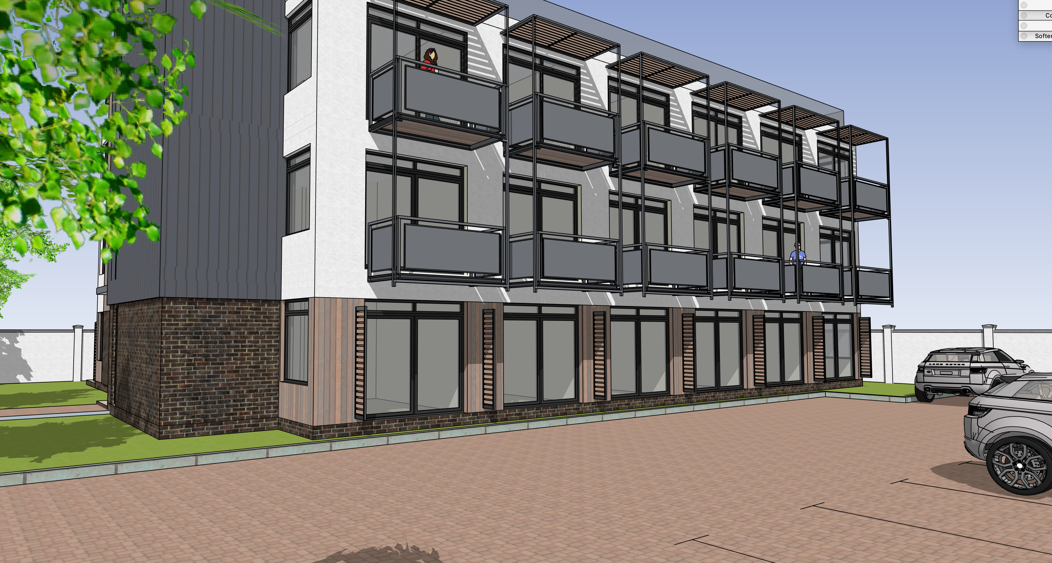 exterior shot modern apartment building with a sleek design the fa ade features grey metal cladding and warm timber cladding and white accents with large geometric windows the roof is dark gray offering a contemporary touch the surrounding landscape is very suburban with vibrant greenery of the lush trees and well maintained grass in light green shades the atmosphere is bright and welcoming with soft natural lighting highlighting the architectural details a few people walk casually along the sidewalk and a modern car passes nearby complementing the urban setting architecture