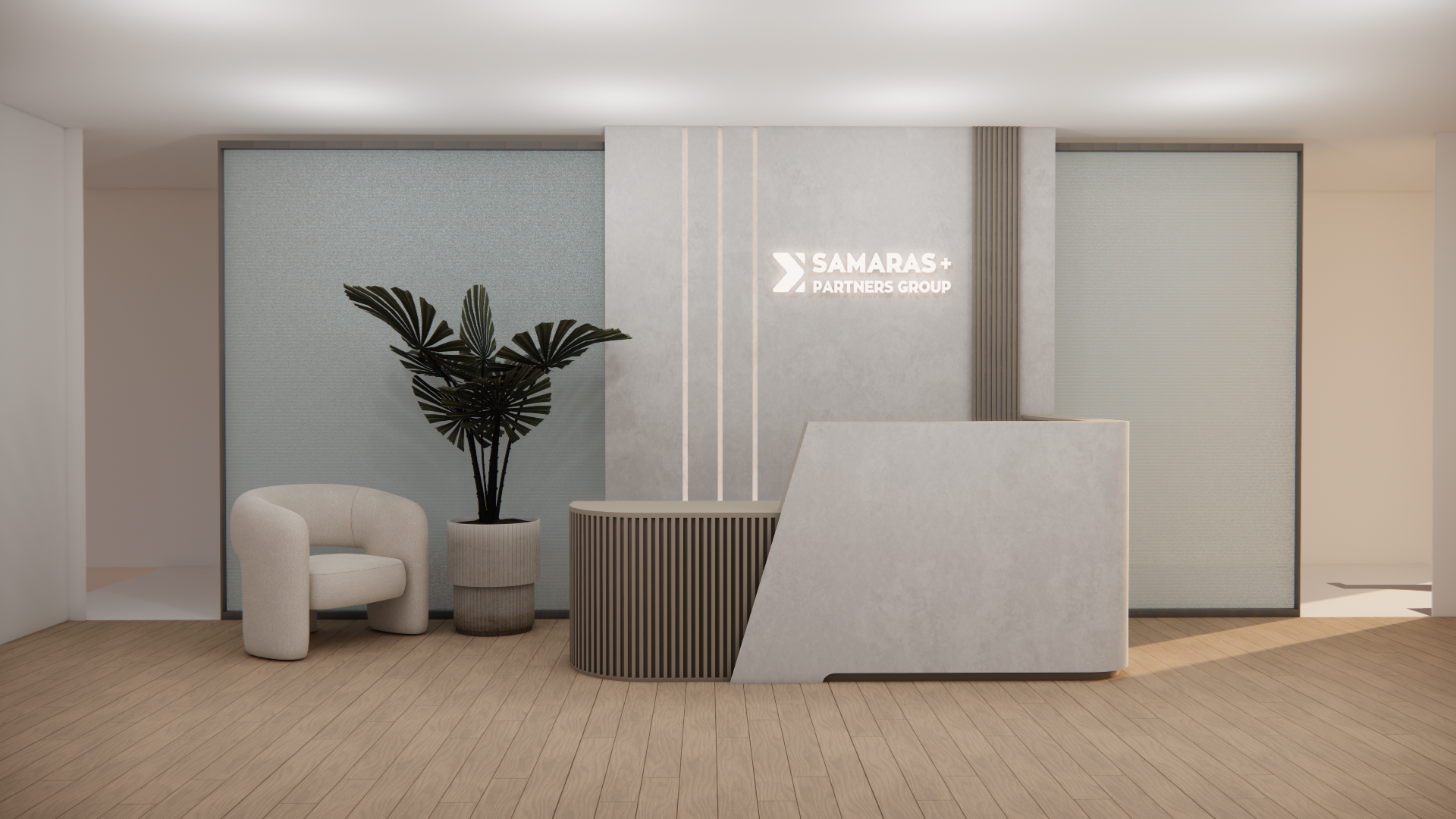 office reception area modern interior design grey stone reception desk grey wood slatted desk base grey light wood floor glass panels with office view back wall with vertical illuminated strips fabric curved armchair large potted fan palm plant professional business environment interior lighting lighted logo do not change it