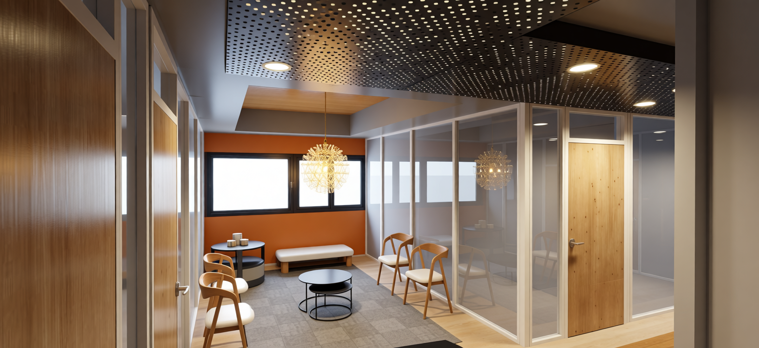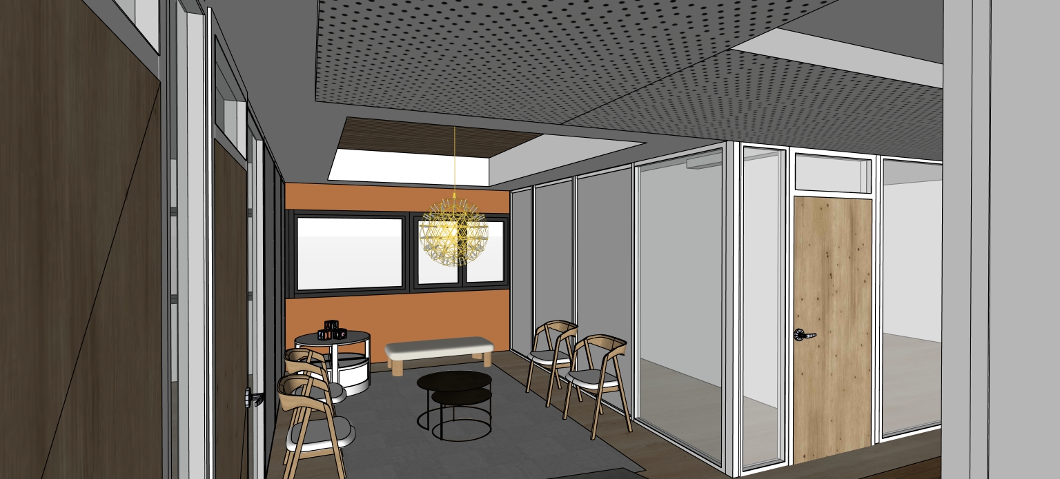 respecter les cloisons gris clair mat et les cloisons vitr es ne pas rajouter de spots garder le mur orange terracotta les cloisons grises sont opaque et ne sont pas r fl chissantes les montants des cloisons mobiles sont blanc les tables basses sont noires mat le mobilier enfant est blanc le banc est blanc pour l assise et en bois pour les pieds enlever les spots au plafond mettre des spots dans le faux plafond ajour blanc du couloir la table de jeu enfant au fond a gauche est blanche respecter les cloisons de droite certaines sont opaques et grises et d autres sont vitr es le faux plafond n est pas clair