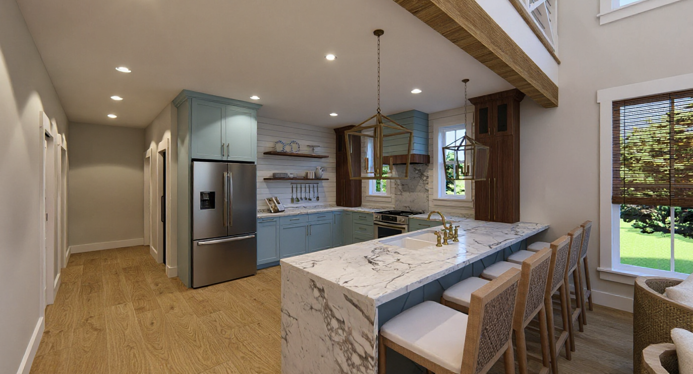 front elevation brick painted cream color with white trim dark grey shingles