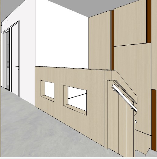 render senyata mungkin dengan panek warna krim polos dan dinding warna off white lantai vinyl krim dan panel di belakanag ubah jadi dinding polos tanpa pola pegangan tangga warna hitam ada lampu indirect di atas pegangan tangga dan di panel tangga yang bolong kasih pajangan dan lampu sorot kecil