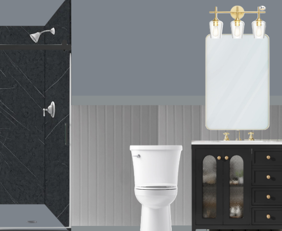 can you put this design in a bathroom change the color of the wall on top to urbane bronze by sherwin williams and the bottom color to shoji white by sherwin williams make the floors a medium brown vinyl plank please