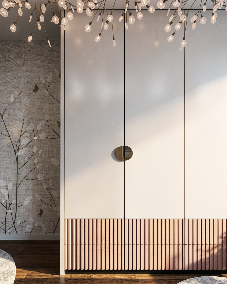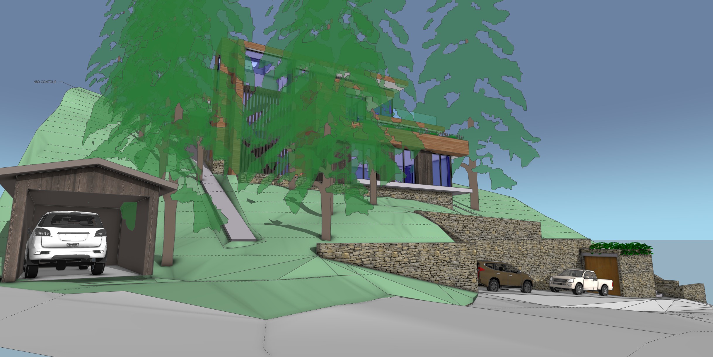 render a tranquil hillside scene featuring a modern multi level wood and glass house the house is situated among lush deep green redwood trees adding a touch of nature s elegance the exterior of the house features warm brown wood accents and expansive glass windows reflecting the surrounding greenery a series of stone retaining walls in shades of light gray and ochre create terraces on the hillside the garage constructed from weathered dark brown wood holds a sleek silver car several vehicles are parked in front a bronze suv a white pickup truck and a light gray car all casting soft shadows on the smooth gray driveway the sky above is a serene gradient of soft azure blue creating a peaceful airy atmosphere include soft sunlight filtering through the trees casting dappled light on the scene enhancing the sense of peaceful seclusion and natural beauty