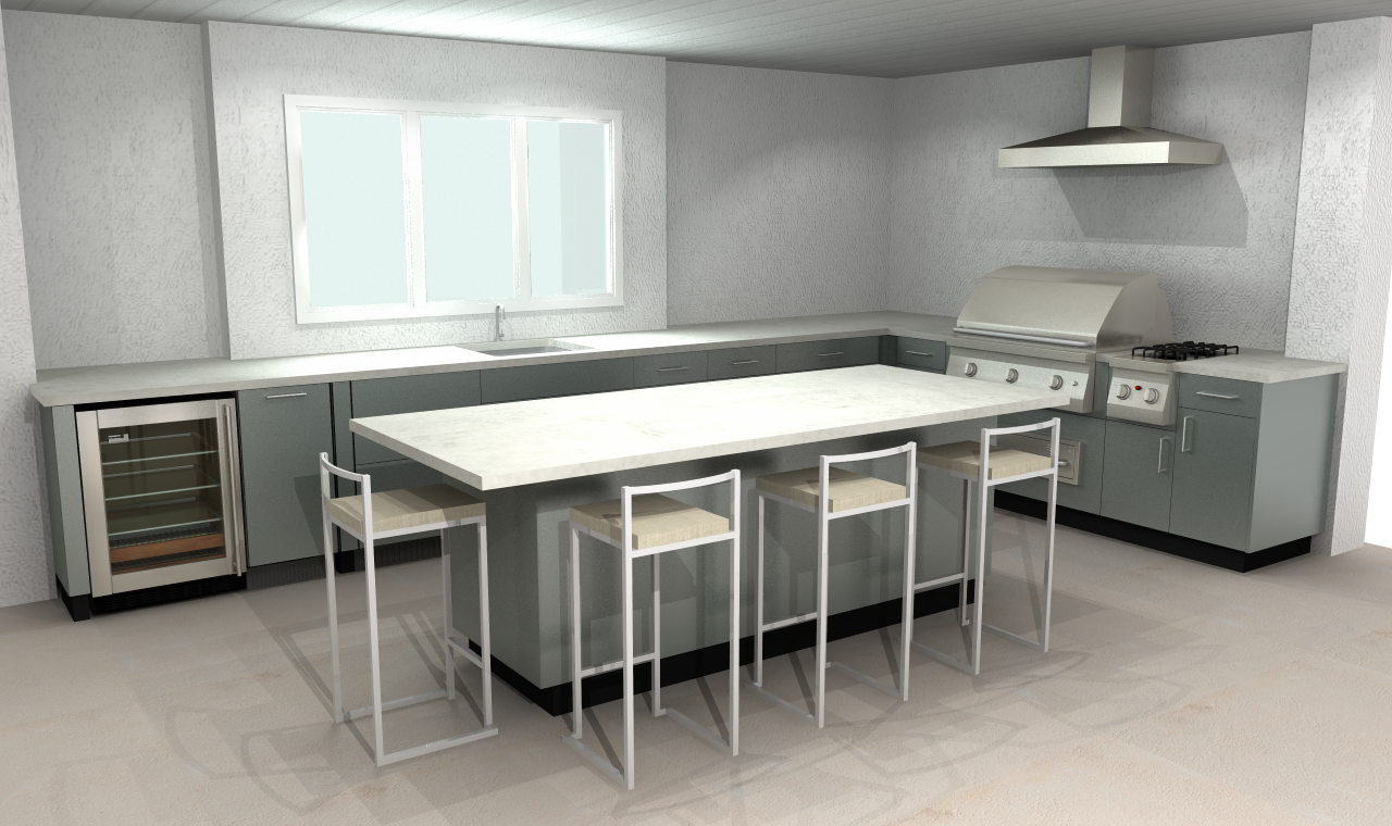 add a platter of food on the island add six bottles of beer on counter near bar fridge add a butcher block cutting board with a steak on the counter near the grill