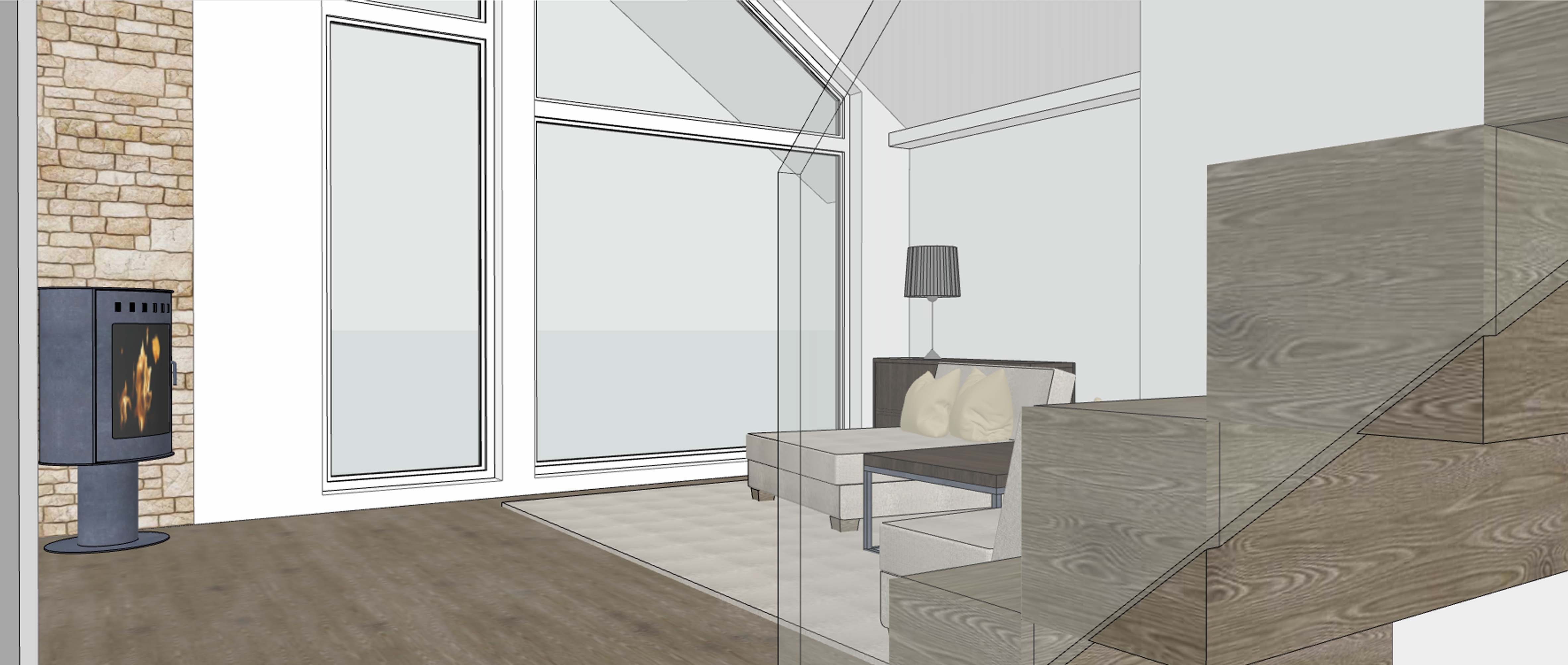 render a cozy and modern livingroom area this picture is taken from the staircase from the curtainlist its a ledlight streaming up agianst the ceiling the lampshade on the cabinet is light blue prints on the pillows in the light coach sea view