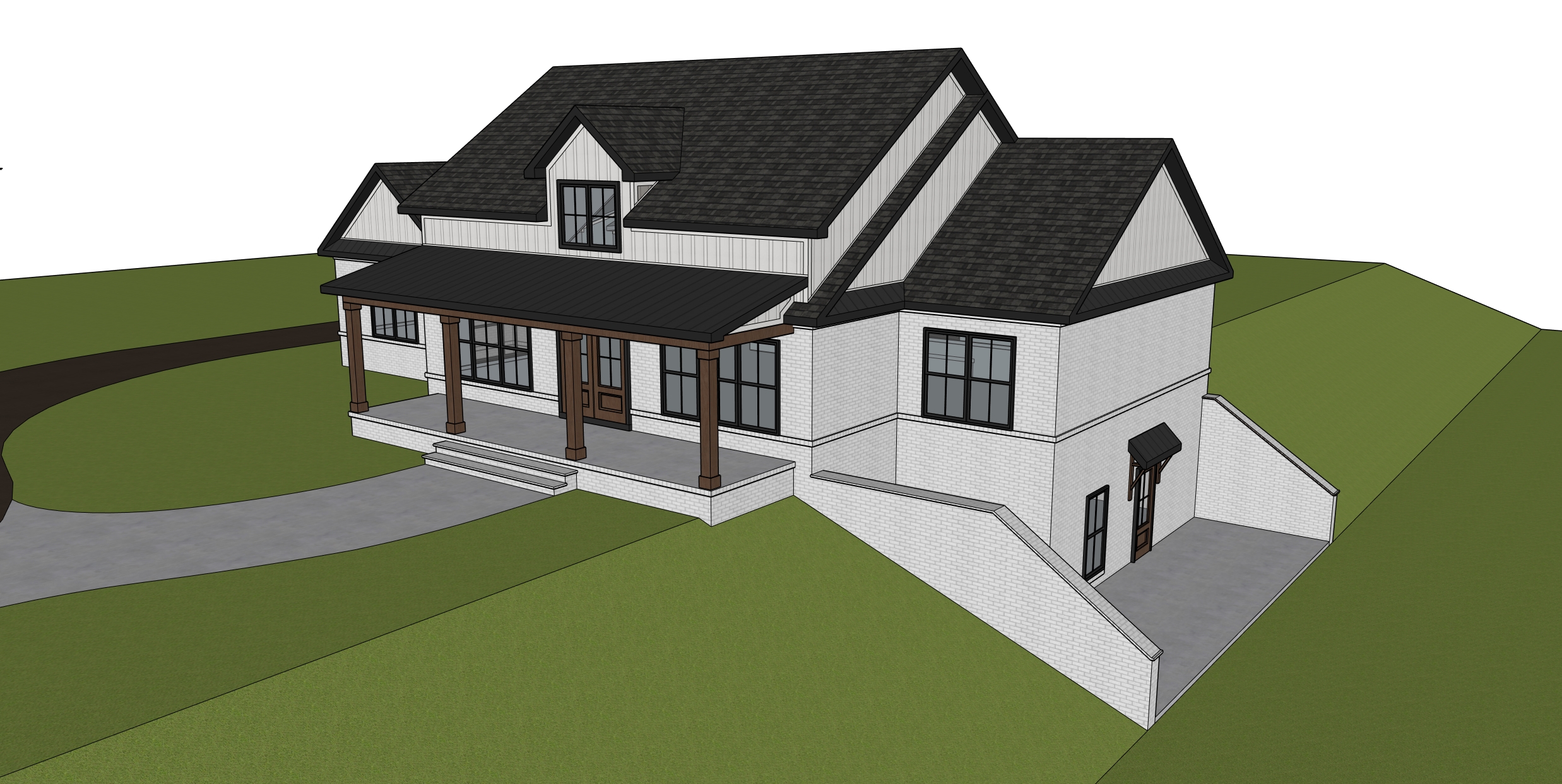 add landscaping add trees in large open land maintain materials and colors make realistic shingle roof on all roofs except metal roof on shed porch roof make brick and siding grey and add wood shutters on windows
