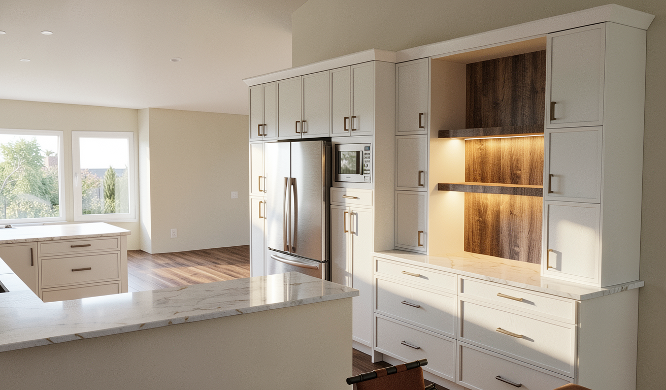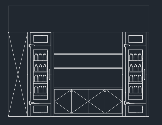 grab and go station light rustic wood paneling open oak wood shelves black granite countertop beverages in the frides