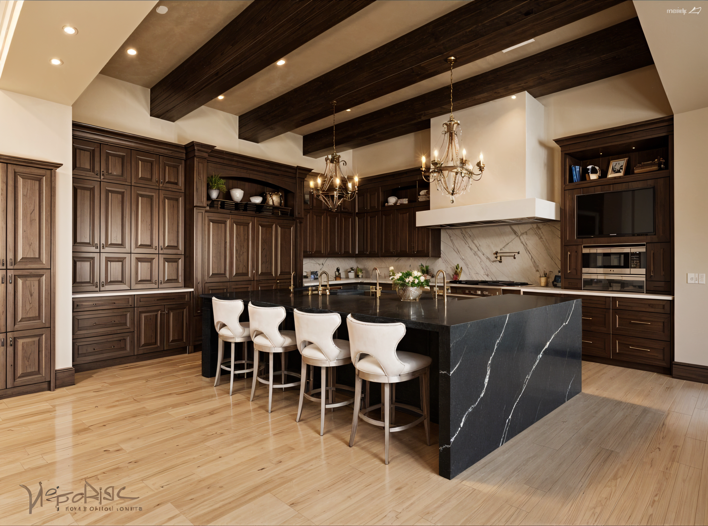 design a striking high end kitchen featuring a wow factor waterfall edge on each side of the kitchen island made of dark brown natural stone with beautiful veining reflecting a super modern luxury aesthetic include a modern hood vent that has light cream beige natural stone cover with no architectural ornate details with the same stone added to the backsplash give me another hood design with modern elements keep the same bar stools as the original image