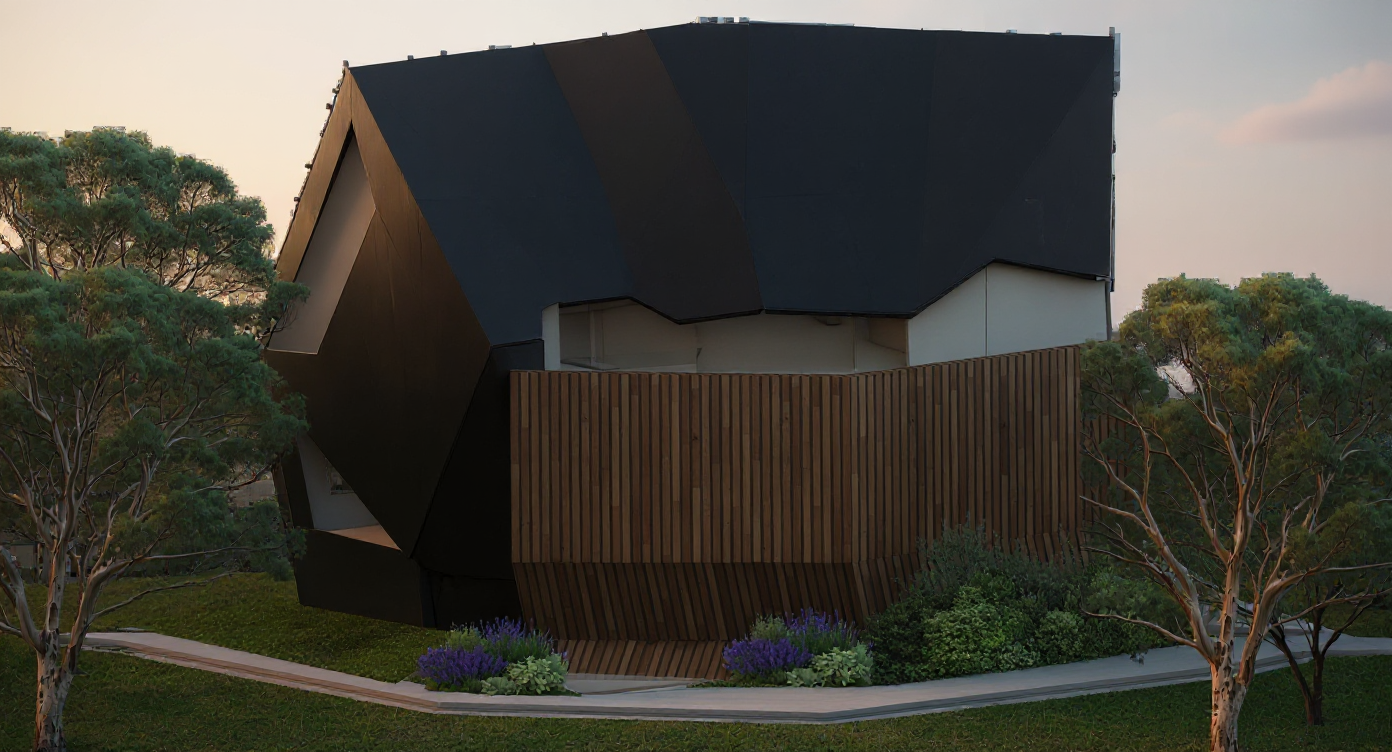 render this building entrance way with soft textures the walls are light grayish wood like a cabin the building rests cliffside in a woodsy environment