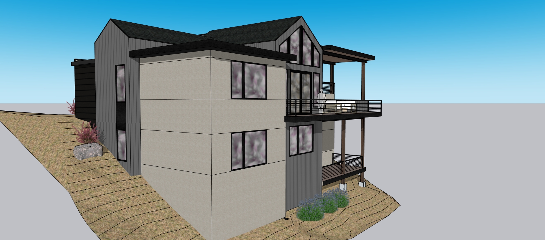 the house is set on a steep hillside with scattered ponderosa pine trees in the background it is a bright summers day the stucco is a medium grey hue the vertical wood siding is a dark grey the windows are black the roofing is black composition shingles with a black fascia the horizontal metal siding is black the deck trim board is black with medium brown decking and roof soffits the railing is a black steel handrail with cable railing below