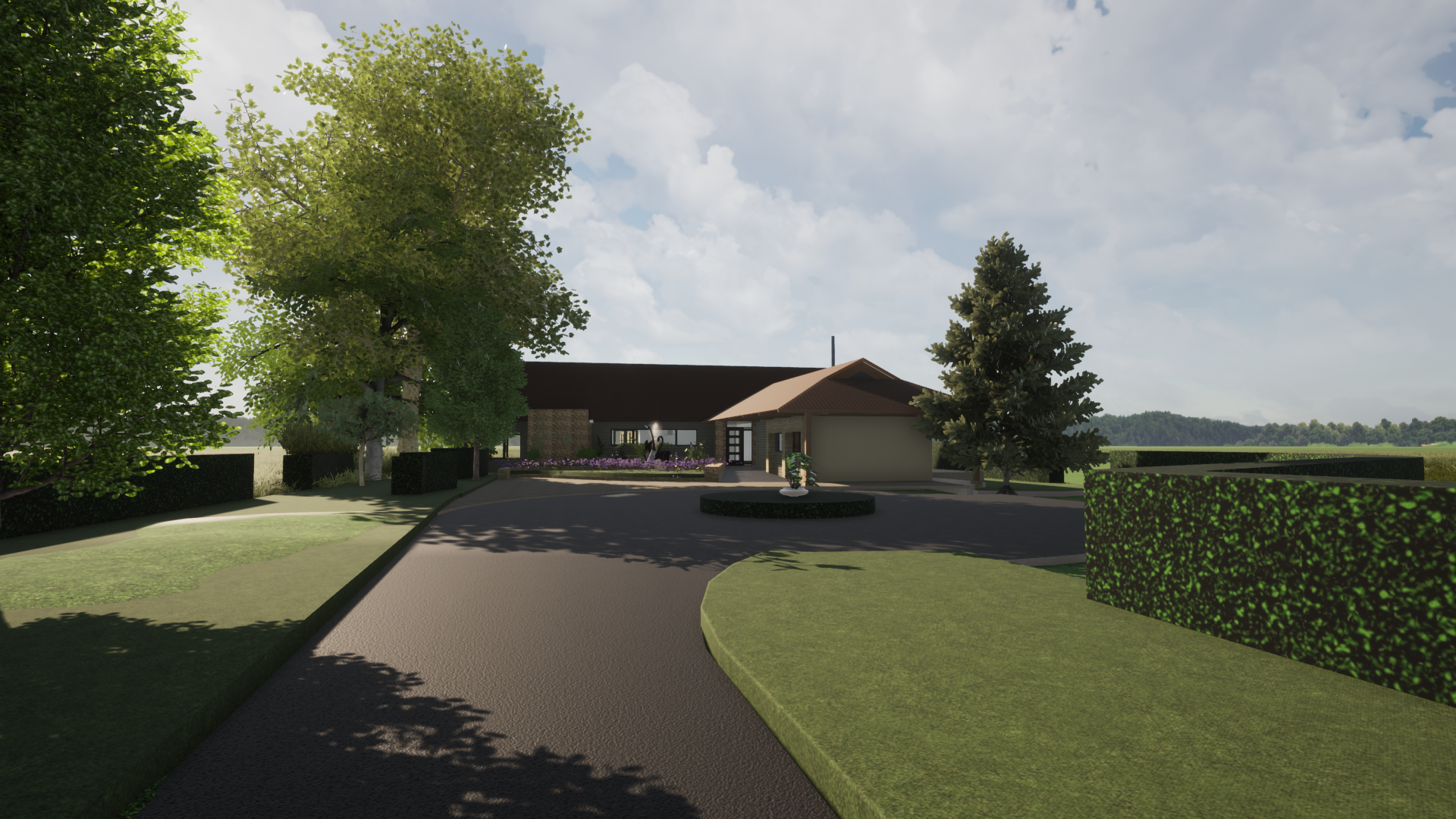a modern architectural scene a driveway tree lined approach featuring a house with a sloped black corrugated roof and textured stone walls the house has large dark framed windows reflecting the blue sky a lush lawn both sides of the driveway creating a vibrant and inviting atmosphere bright sunlight filters through the leaves of a nearby tree casting playful shadows on the ground the overall atmosphere is serene and harmonious with a gentle breeze under a partly cloudy sky