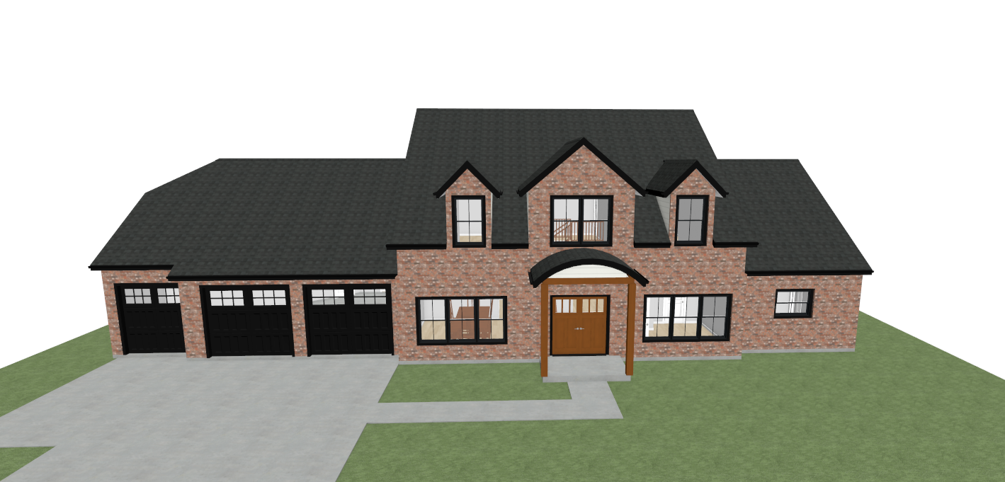 add landscaping low shrubs partly cloudy skies well manicured grass lights on inside the house